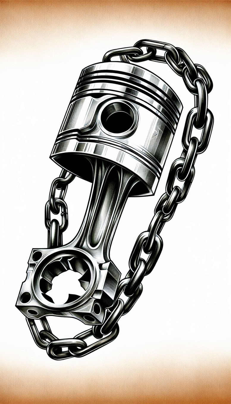 Presented as an AI-generated tattoo project, this piston and chain design is rendered in black and grey linework with bold shading to capture metallic surface, weight, and motion. The central motif is a piston block with a circular combustion chamber, connected by a curving rod to a heavy chain that loops around the piece, forming a strong silhouette that reads well on limbs. The piston head is detailed with crisp bevels and reflective highlights, while the connecting rod tapers and is cross-hatched to suggest depth, texture, and engine-inspired energy. The chain links are thick, interconnected ovals with shaded interiors to convey weight and density, creating a dynamic loop that guides the eye toward the piston. The composition is designed to be scalable, working as a compact ankle tattoo or as a larger shoulder or forearm piece. The concept leans into industrial symbolism—persistence, mechanism, and resilience—making it a meaningful tattoo design for someone drawn to mechanical or urban motifs. The stark black ink against grey shading yields a high-contrast result that remains legible over time, and the style sits comfortably within black and grey realism and bold linework aesthetics. It is also well-suited as a cover-up option when covering previous darker ink, due to its dense blacks and blocky shapes that effectively mask underlying tones. As an AI-generated tattoo project, it showcases how digitally conceived imagery translates into ink-ready body art, offering a customizable template for placement, scale, and individual preference. Keywords integral to this tattoo design include tattoo, tattoo design, meaningful tattoos, fine line tattoo, lotus flower tattoo, infinity tattoo, tribal tattoo, rose tattoo design, small tattoos, flower tattoos, custom tattoo design, Japanese style tattoo, black and grey, realistic tattoo, body art, ink. The matter is further strengthened by the graphic pattern created by the repeating chain links, making pattern a natural tag for this piece.