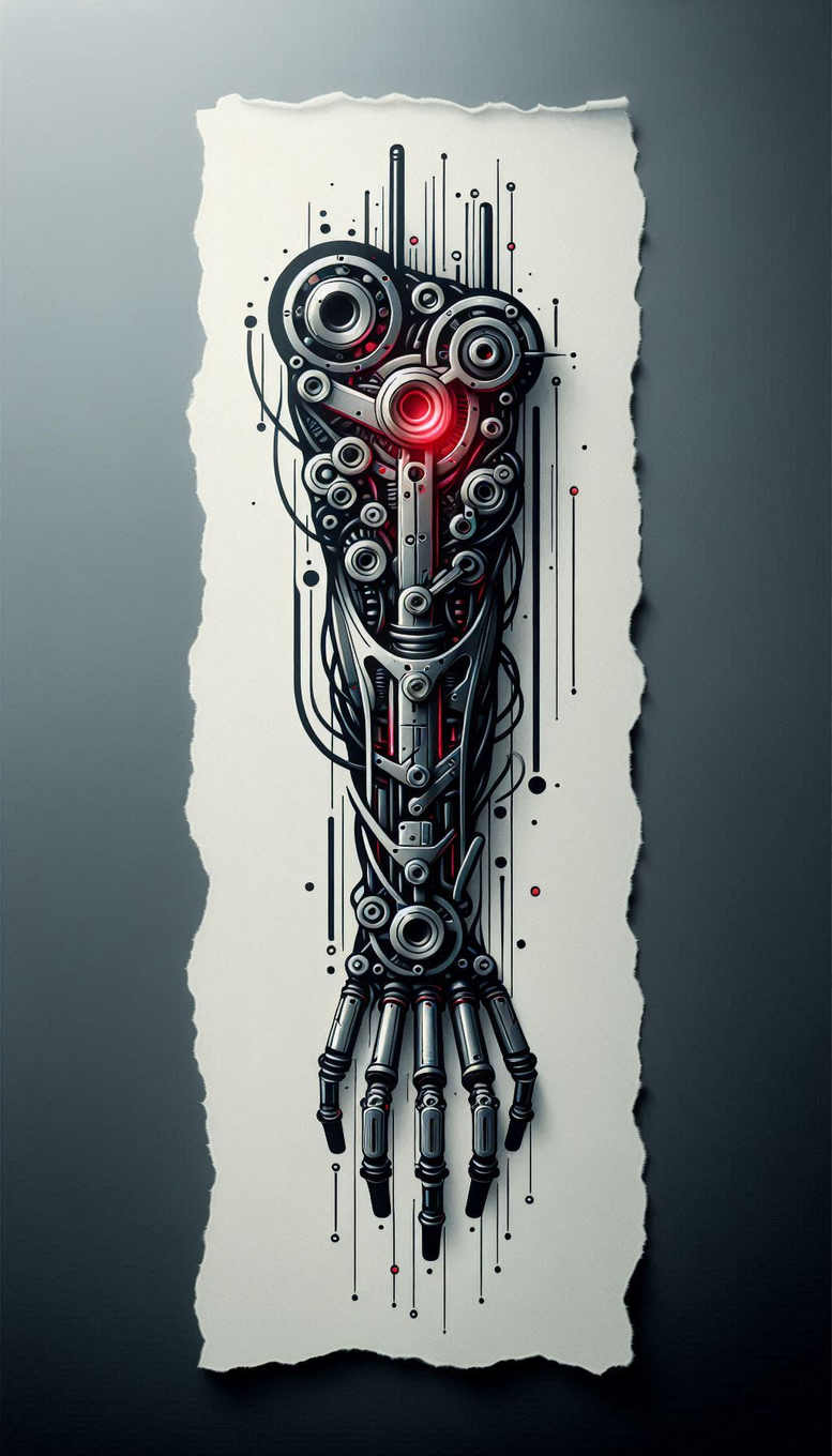 An AI-generated tattoo project, this piece presents a cybernetic hand rendered as a highly detailed tattoo design that fuses human anatomy with machine aesthetics. The forearm is built from interlocking plates, gears, pistons, and circuitry, executed in black and grey with precise line work and soft metallic shading to evoke chrome and steel. A glowing red core sits at the palm, surrounded by circular gear motifs and a brace of tubes and connectors that lead into a layered and elongated finger structure. The composition favors graphic patterning: circular gears, linear bars, and network traces create rhythm and depth, ensuring legibility on skin at various sizes while delivering a futuristic, mechanical vibe. The design reads as a concept rather than a finished subject, appropriate for a bold representational tattoo and—given its dense coverage—well-suited for a cover-up if needed. The symbolism centers on human-machine integration, resilience, and evolution, making it a meaningful tattoo design for seekers of body art with a tech-forward narrative. Key elements to tag include hand, gear, wire, circuit, and rod fragments, all arranged to balance negative space with intricate detail. This piece sits comfortably within realistic black and grey tattoo aesthetics and cyberpunk-inspired themes, offering a versatile template for a custom tattoo design that can scale from small accents to full forearm sleeves. It also explores texture and depth through layered shading, high-contrast edges, and selective red highlights, allowing the artist to push the contrast range while maintaining a cohesive, high-impact look. In terms of SEO, the concept aligns with tattoo design, meaningful tattoos, fine line tattoo, black and grey realism, body art, ink, and other contemporary search terms used by enthusiasts.