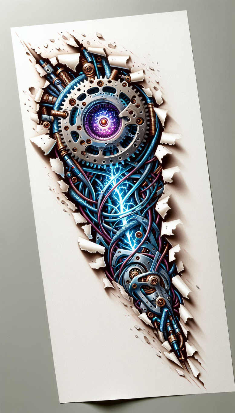 An intricate cybernetic eye gear tattoo design forms the centerpiece of this large, full-color composition. A rotating metal ring frames a radiant purple core, while copper bolts, steel plates, and a tangle of blue cables compose a dense, gear-driven anatomy that feels both industrial and alive. The electric blue energy veins streak downward, lighting a network of circuits that threads through the piece with razor-sharp precision. Torn paper margins surrounding the design create dramatic depth, as if the torso or limb is being pierced by a robotic mechanism, pushing the image outward from the skin. The render blends graphic line work with high-gloss highlights to mimic metal textures, while the vibrant palette of metallic silvers, cobalt blues, and violet accents reinforces a cyberpunk sensibility without sacrificing readability on skin. The motif nods to mechanical realism and surreal electricity, alluding to themes of perception, energy, and the fusion of human and machine. In terms of style, it straddles graphic tattoo design and realistic tattoo texture, offering bold, high-contrast presence suitable for a sleeve or back piece, yet adaptable to a dramatic forearm composition. For symbolism, the eye stands for insight and vigilance; the gear signifies process and precision; the blue current represents flow of ideas and digital memory. This is an AI-generated tattoo project that demonstrates a pattern-forward approach with potential as a confident cover-up option when darker work exists, while inviting a discussion about meaningful tattoos, custom tattoo design, and ink techniques. SEO keywords include tattoo, tattoo design, meaningful tattoos, fine line tattoo, lotus flower tattoo, infinity tattoo, tribal tattoo, rose tattoo design, small tattoos, flower tattoos, Japanese style tattoo, black and grey, realistic tattoo, body art, ink.