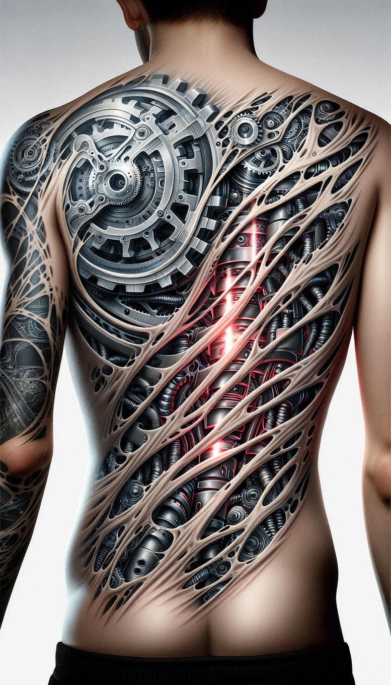 This AI-generated tattoo project presents a cover-up-ready back piece that fuses biomechanical engineering with a torn-skin pattern. The central motif is a large circular gear surrounded by interlocking machinery, hidden beneath shredded skin ribbons that sweep diagonally across the back. Pistons, tubes, and micro-components weave through the flesh, giving the impression of an engine powering the body. A red glow pulses through inner conduits, creating a bold contrast to the dominant black and grey palette and heightening the sense of motion and life within the mechanics. The torn-skin effect is meticulously crafted to camouflage existing ink while delivering a modern, high-impact body-art statement. Technique emphasizes crisp gear teeth, smooth gradient shading, and subtle stippling to differentiate metal, tissue, and skin, producing a hyper-realistic look. The composition balances symmetry with dynamic flow, using the outer torn layer as a frame to draw attention to the central gear and the illuminated inner components. Symbolically, the design can represent resilience, precision, and the inner workings of the wearer’s journey, making it a meaningful tattoo choice for those seeking a bold statement. This is a customizable, large-back tattoo design relevant to black and grey realism, with potential for color tweaks or light pattern integration. As an AI-generated tattoo project, it showcases how digital concepts translate into tangible ink and serves as a flexible blueprint for a cover-up that remains contemporary and highly detailed in body art.