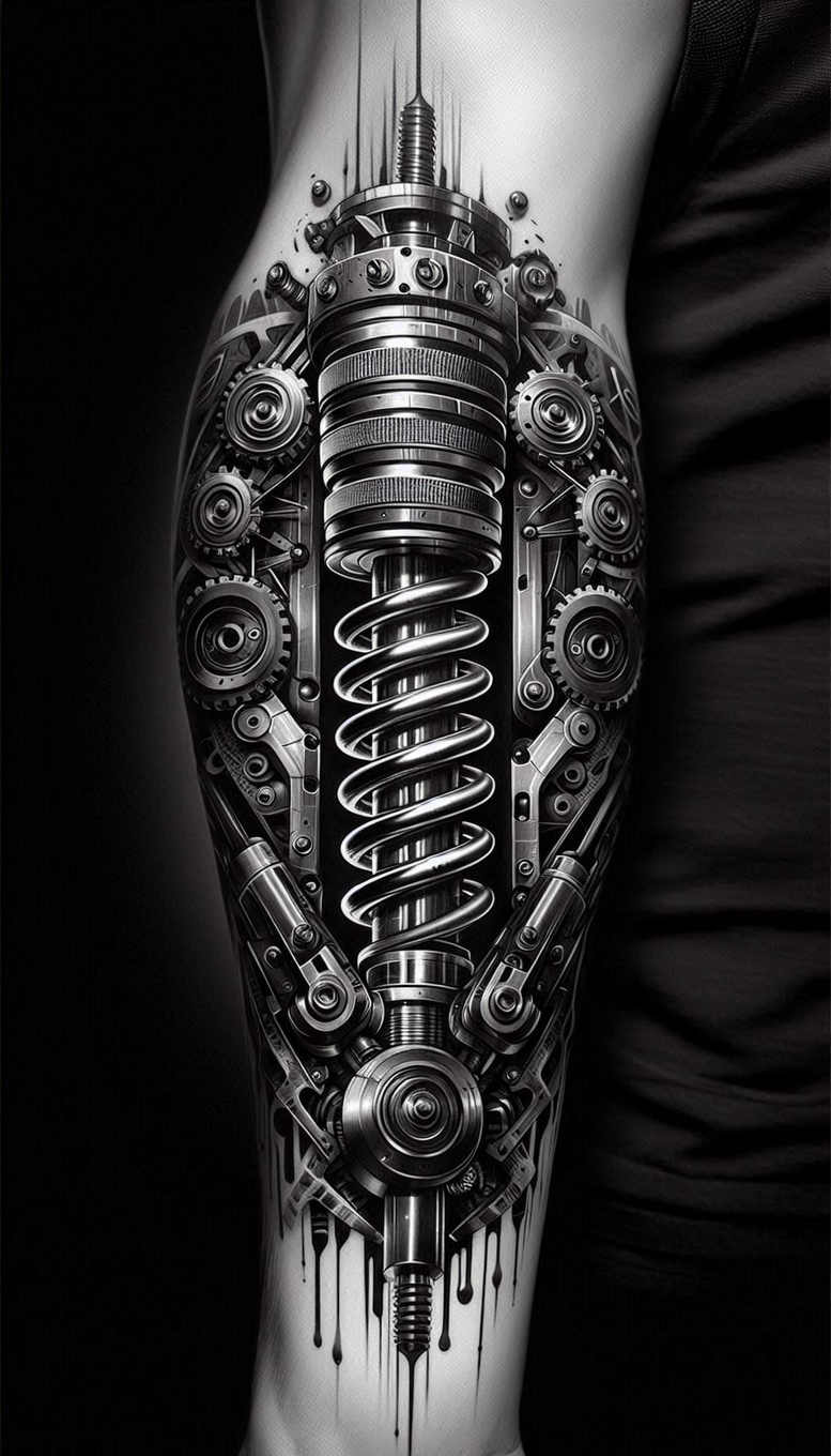 This AI-generated tattoo project presents a hyper-detailed mechanical forearm sleeve in black and grey. The central motif is a bold coil spring, surrounded by interlocking gears, pistons, plates and bolts that create a cohesive engine-like anatomy along the forearm. The shading and metallic highlights mimic brushed steel, with careful contrast between the darkest blacks and lighter reflections to achieve a realistic, almost three-dimensional impression. The composition emphasizes symmetry and rhythm, with mechanical elements framing the limb and trailing components that drip into the lower wrist area to suggest motion and energy. The pattern-like arrangement of gears and linkages gives the piece a strong visual unity, making it suitable for a cover-up of existing ink where dark areas can blend into the mechanical facade. The design can be adapted to larger sleeves or integrated into other body areas, preserving negative space at the outer edge for balance. Symbolically, the gears and spring evoke themes of resilience, adaptability, and the human body as a machine, a metaphor for continuous repair and forward motion. From a technique perspective, the artist uses smooth gradients, crisp linework for gears, and high-contrast metallic shading to create depth; the composition relies on layering of mechanical components to achieve a seamless wrap. In the realm of tattoo storytelling, this piece qualifies as a modern, dark, highly graphic design that leans toward realism while embracing industrial motifs. AI-generated tattoo projects like this one demonstrate how digital concepting can translate into tangible ink-ready ideas for clients seeking bold, durable body art. For those considering a highly detailed, pattern-rich tattoo, this design provides a powerful template, particularly as a black and grey, cover-up friendly option. Keywords woven through the narrative include tattoo, tattoo design, meaningful tattoos, black and grey, realistic tattoo, pattern, cover-up, and custom tattoo design, ensuring visibility in search and catalogs while remaining faithful to the visual narrative of mechanical artistry.