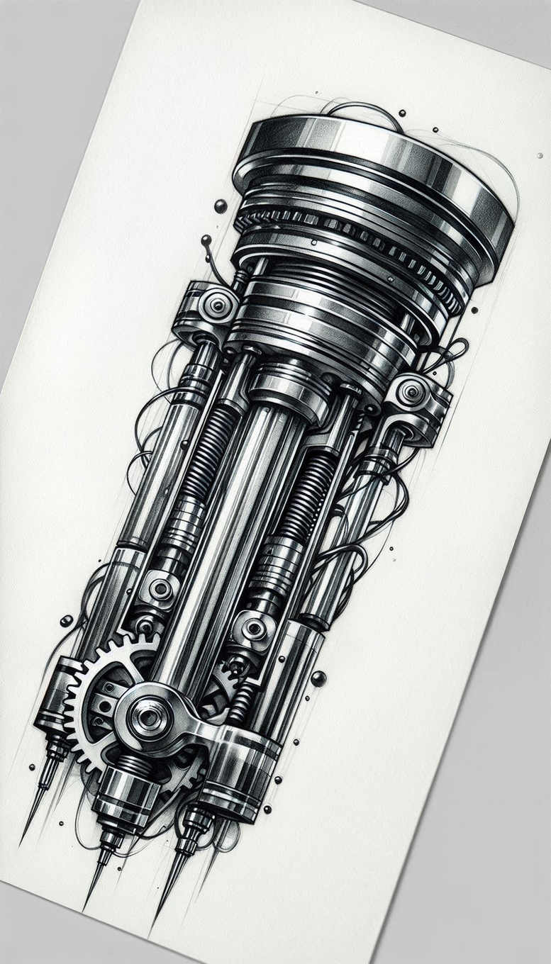 Presented as an AI-generated tattoo project, this design translates a precision-driven mechanical assembly into a bold study of form and function, ideal for enthusiasts of black and grey tattooing. The central feature is a tall cylinder or reactor housing, composed of stacked rings and pistons that suggest motion and containment. Gears accrue along the base and extend upward, their teeth interlocking with tubes and cables that weave through the piece, adding rhythm and a sense of energy. The shading alternates crisp highlights with deep graphite shadows to mimic chrome surfaces, creating a metallic gleam that reads well on skin. The composition balances negative space with dense linework, allowing the machine to breathe while remaining legible as a tattoo design. Each element acts as an emblem: the gear stands for industry and precision; the cylinder implies endurance; the rods and springs evoke tension and resilience, while the piping hints at connectivity and flow. The result is a pattern-rich motif that can be adapted as a cover-up for older or more dominant tribals or body art. While the imagery is technical, it carries universal symbolism—mechanical mastery as a metaphor for focus, discipline, and the fusion of human intention with engineered systems. For collectors of custom tattoo design, this piece harnesses the allure of Japanese-inspired linework and black and grey realism, yet remains suitable for a range of skin tones and body placements. In addition to its striking aesthetics, the design is versatile as a small tattoo or a larger sleeve component, inviting the wearer to explore fine line tattoo techniques, bold shading, and subtle gradient transitions. This concept blends ink style with a timeless appreciation for mechanics, turning gears into a wearable sculpture. If one is seeking a highly technical tattoo design with meaningful tattoos’ connotations of resilience, this piece offers a polished, modern interpretation, aligning well with industry trends toward everyday-workshop imagery and steampunk flair. Because it is AI-generated, it also serves as a contemporary example of machine-generated art in tattoo culture and invites dialog about the evolving role of technology in body art. The result is a compelling black and grey tattoo that reads as a continuous machine, a reminder that art and engineering can converge into expressive ink.
