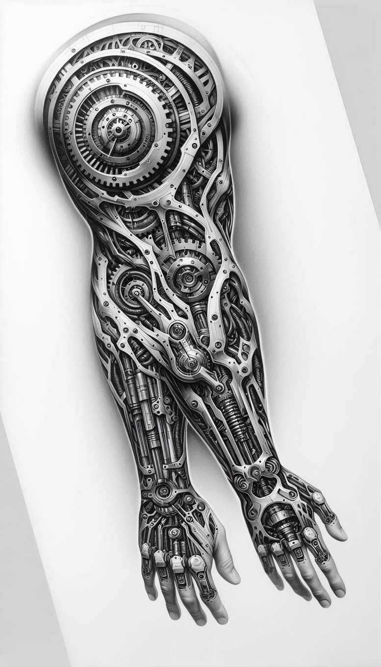 AI-generated tattoo project: this forearm study in mechanical anatomy features steel gears, cogs, pistons, and interlocking plates fused with the organic contour of the arm. Rendered in black and grey, the fine-line technique delivers crisp edges and subtle gradient shading that read as machined metal on skin. A circular clockwork wheel anchors the upper forearm, its spokes dissolving into a lattice of gears that cascade toward the wrist, while slender struts and pistons thread through the musculature like a hidden vascular network. The composition uses tonal variety, cross-hatching, and negative space to build depth that rewards close inspection while remaining legible at tattoo size. The result feels both futuristic and timeless, a statement about time, craft, and the human-machine interface. The machinery motif acts as a pattern of functional ornament, turning the forearm into a technical canvas that can function as a stand-alone piece or seamlessly integrate with existing ink for a cover-up. The concept supports adjustable scale, from small forearm tattoos to larger sleeves, and is amenable to Japanese style tattoo influences or Western biomechanical aesthetics; in black and grey ink it maintains strong contrast, longevity, and a believable metal texture. In terms of meaning, the gears symbolize precision, endurance, and interconnected life, while the exposed inner workings invite contemplation of how technology extends identity. For tattoo lovers seeking meaningful tattoos, this design could pair a lotus flower tattoo or infinity tattoo motif with mechanical elements; it also nods to tribal tattoo traditions and rose tattoo design motifs, while remaining suitable for small tattoos, custom tattoo design, and body art. This is an AI-generated tattoo project that demonstrates how engineering motifs can translate into expressive ink, reinforcing the value of fine line tattoo technique and the versatility of black and grey body art.