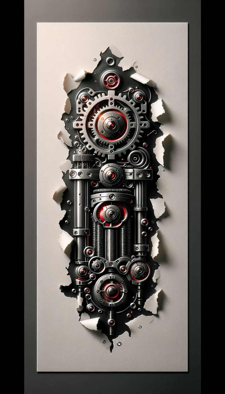 An industrial clockwork montage emerges through torn plaster, exposing a seamless assembly of gears, rings, and pistons. Rendered with meticulous shading and crisp edgework, this piece reads as a high-detail machine tattoo concept suitable for a cover-up: the dark tonal range and dense machinery provide excellent concealment while offering striking visual impact. The central gear collage is flanked by cylindrical columns and threaded rods, linked by bolts and screws; metallic surfaces show brushed textures, micro-scratches, and red accents that create focal points. The jagged wall edges heighten depth, giving the illusion that the engine has burst from the skin. This design leans into a steampunk-inspired aesthetic with mechanical precision and could translate into a full-back piece or a long sleeve as a bold centerpiece. The black and grey palette anchors the imagery in a timeless masculine vibe, while the red highlights evoke ignition and energy. Techniques to achieve this look include fine line work for small components, strong shading for depth, and high-contrast highlights to mimic reflective metal; the result is a realistic tattoo style that rewards close inspection yet remains legible at a distance. The symbolism rides on time, motion, and resilience—gears turning in the machinery of life—alongside a nod to engineering craftsmanship and repair through cover-up strategies. These are AI-generated tattoo projects that explore a clockwork motif as a bold body art statement, aligning with trends in custom tattoo design and mechanical realism. The design accommodates a variety of placements and scales, from intricate forearm pieces to larger back panels, while preserving a pattern-rich composition that remains coherent across panels. For clients seeking meaningful tattoos beyond florals or silhouettes, this piece offers a durable, statement-making option that pairs well with black and grey ink, with potential tweaks to suit Japanese style tattoo sensibilities or a more restrained fine line approach. In sum, this is a vivid, pattern-driven, industrial tattoo concept ready for translation into real art, embodying both technological aesthetics and personal symbolism through ink.