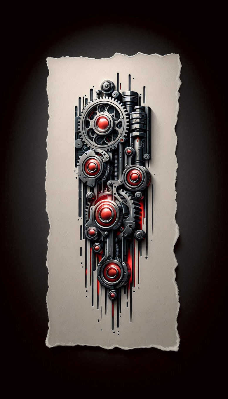 This AI-generated tattoo project presents a high-contrast mechanical motif built from interlocking gears, cog wheels, pistons, and slender rods that cascade down a vertical strip of torn parchment. The design reads as a fusion of industrial precision and organic movement, with metallic shading achieved through a careful balance of black and grey gradients and polished silver highlights, punctuated by bold red cores that draw the eye to the center of each gear. The composition relies on a vertical spiral of circuitry-like elements, where large wheels anchor the upper third and smaller gears trail downward, integrated with vertical bars and tubular accents that resemble machinery in motion. The execution emphasizes crisp linework, meticulous curvature, and layered shading to create a sense of depth and mechanical rigidity that would translate well to a tattoo design on the forearm or calf. Visually, the piece marries graphic pattern with realistic texture, offering a dense, almost sculptural effect that suggests movement and energy. The symbolism evokes time, precision, and industrial progress, while the red cores can symbolize vitality beneath a cool, metallic exterior. For tattoo enthusiasts seeking a bold, statement piece, this concept functions as a meaningful tattoo design that can be scaled, adjusted for black and grey or full color, and adapted into a custom tattoo design with Japanese-inspired sharpness or a neo-traditional edge. Because the image features a densely packed, gear-driven pattern, it works well as a cover-up for older ink, especially on darker skin tones where solid blacks and layered shading can obscure previous markings. In short, this is a modern, AI-generated tattoo project that blends pattern, realism, and mechanical artistry into a striking body art render suitable for large panels or sleeves. Keywords: tattoo, tattoo design, meaningful tattoos, realistic tattoo, black and grey, ink, body art, custom tattoo design, mechanical gear, gear pattern, red accents, clean linework.