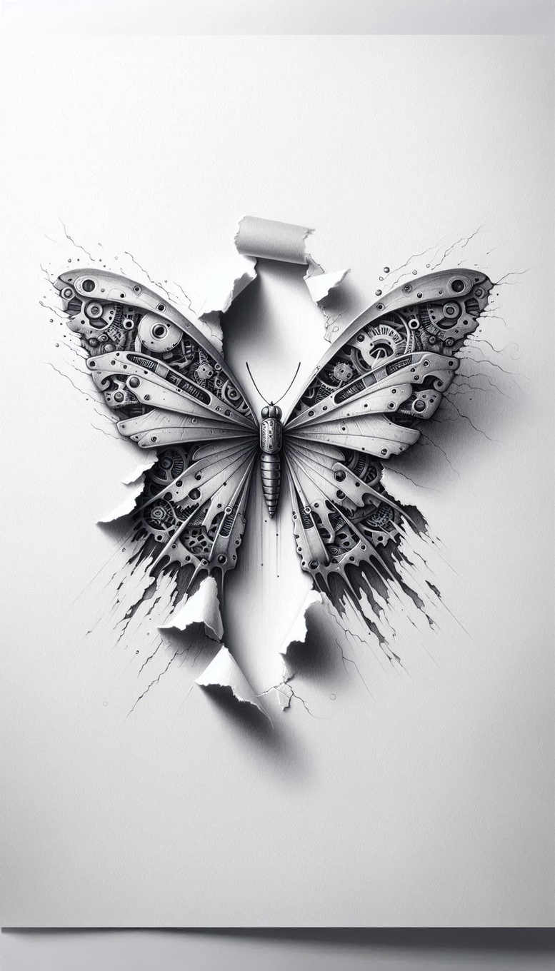 This AI-generated tattoo project concept features a butterfly formed from an intricate lattice of gears and mechanical plates. Each wing is a mosaic of cogs, springs, rivets, and shield-like segments that read as both insect and engine when rendered in black and grey. A torn-paper effect behind the creature reveals a shadowed void, suggesting skin rippling to expose inner mechanism. The body is slender, with a segmented abdomen and delicate antennae that extend into negative space, providing fine line accents along the wing edges. The overall shading relies on smooth gradients and crisp linework to achieve a realistic tattoo look, with high contrast between the bright white background and the dense, graphite-like grayscale of the gears. Symbolically, the piece marries metamorphosis (the butterfly) with human ingenuity (machinery), conveying transformation, resilience, precision, and the fusion of nature and craft. The design nods to industrial and Japanese-inspired mechanical art, balancing bold shapes with subtle textures that ensure legibility on different body canvases. It scales well from small tattoo designs suitable for the shoulder blade to larger back pieces, and it can be repurposed as a cover-up for older ink thanks to the torn-paper motif which can obscure unwanted marks beneath the gearwork. As a custom tattoo design, it invites interpretation: the gears can symbolize the inner workings of personal change, while the butterfly remains a universal emblem of growth. The concept is designed to stand as a meaningful tattoo for clients seeking a unique, bold, and enduring piece. AI origin: these are AI-generated tattoo projects created to explore futuristic, metallic, and nature-inspired contrasts. Keywords: tattoo, tattoo design, meaningful tattoos, fine line tattoo, lotus flower tattoo, infinity tattoo, tribal tattoo, rose tattoo design, small tattoos, flower tattoos, custom tattoo design, Japanese style tattoo, black and grey, realistic tattoo, body art, ink. In practice, the design can be rendered with micro-dot shading and fine-line contours to preserve readability across skin tones. It is a bold statement piece for those who value mechanical aesthetics and natural symbolism.