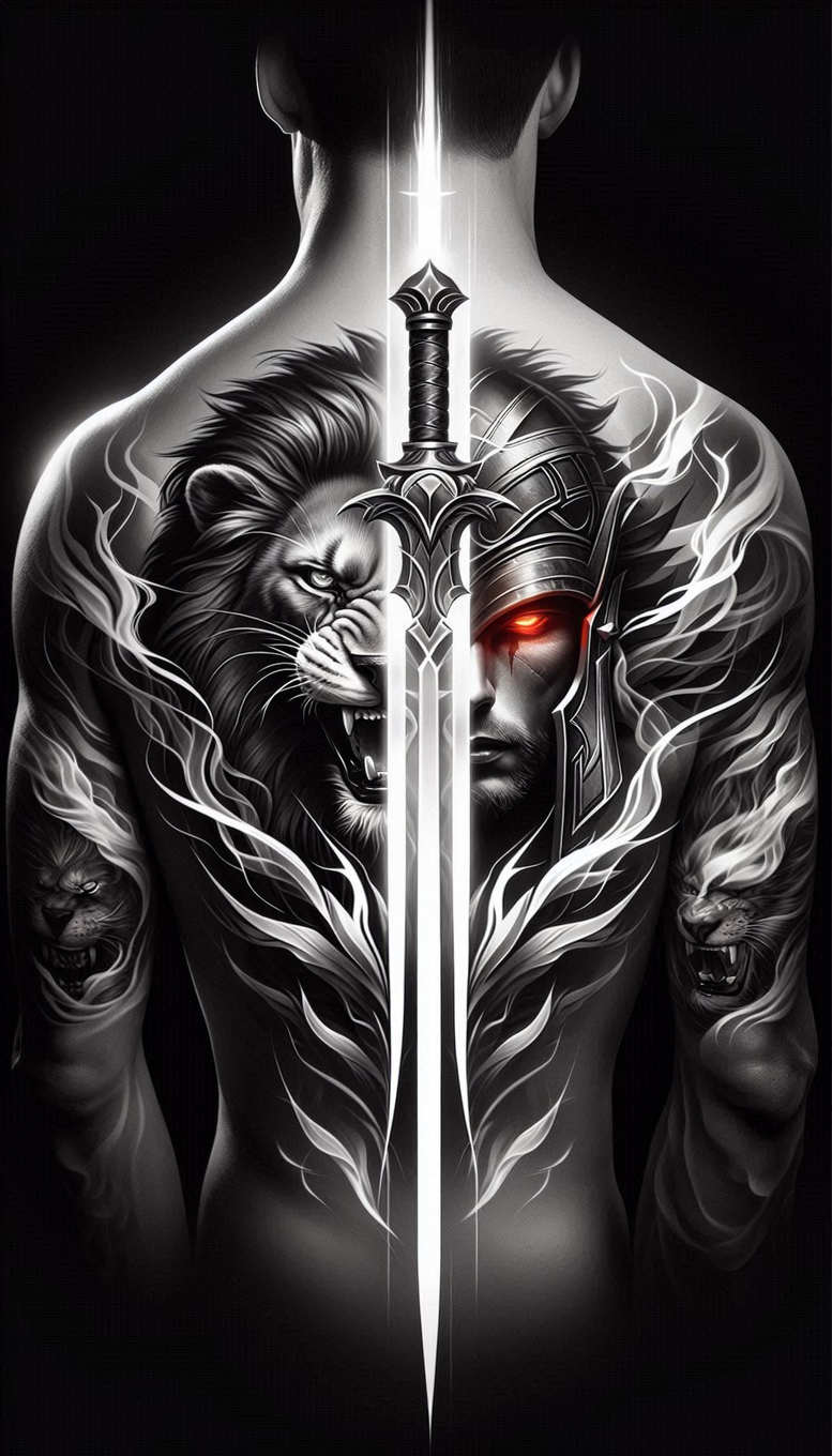 AI-generated tattoo project presented here as a large back piece in black and grey. The design centers on a tall double edged sword bisecting the back vertically, its blade rendered with crisp linework and smooth gradient shading that creates a glossy steel illusion. On the left, a lion’s head emerges in fierce realism, its mane flowing into a torrent of graphic linework that dissolves into the sword and forms smoke like wisps around the central axis. On the right, a stylized knight helmet anchors the composition, its plates and a single red eye accent providing a focal point and counterpoint to the monochrome shading. Surrounding all elements are flame like motifs that swirl along the spine and shoulder blades, weaving between the figures and enhancing the sense of motion. The overall treatment is high contrast black and grey, which sharpens silhouettes and helps the piece read from a distance while revealing intricate detail up close. The heavy blacks and negative space also support a potential cover up option for existing ink since they allow darker areas to mask underlying work. Key elements include sword, lion, helmet, flames, mane, armor plates, and smoke, all orchestrated to tell a fragmentary mythic narrative about power and protection. From a technique standpoint the artist relies on crisp edge definition with controlled shading to render the lion with lifelike texture while maintaining a cohesive graphic feel suitable for a back canvas; this approach aligns with fine line tattoo aesthetics and contemporary graphic tattoo design. The symbolism is layered: the sword serves as a vertical axis of strength, the lion embodies courage, and the armored figure represents discipline and guardianship, with flame motifs suggesting transformation. This tattoo design sits at the crossroads of realistic black and grey ink and traditional Japanese style influences, making it a strong option for meaningful tattoos, custom tattoo design, small or large pieces, and body art. For clients seeking cover-up potential, the design offers bold silhouettes, deep shadows and dense shapes that can effectively conceal prior work while leaving room for future additions. As an AI generated concept, it demonstrates how modern tattoo design can fuse mythic iconography with precise technical execution into a dramatic back piece that captures attention and invites closer inspection.