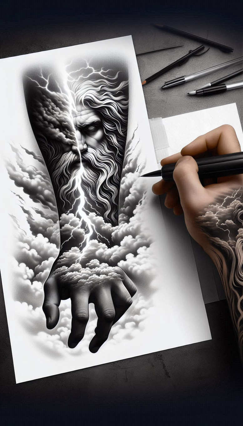 Poseidon, the sea god of Greek mythology, is reimagined as a contemporary tattoo design in a black and grey illustrative style. The concept centers on a towering trident piercing curling ocean waves, with salt foam and spray rendered in fine line detail to create texture and depth. The composition favors a balanced vertical axis that could sit gracefully on the forearm, shoulder, or chest, while surrounding negative space keeps the design legible at smaller sizes. The shading relies on layered graphite tones to convey weight and volume, with sharper lines defining the trident prongs and softer gradients filling the waves. The motif blends classical iconography with modern tattoo artistry, offering a timeless emblem of power, mastery of the seas, and personal resilience. In symbolism, Poseidon’s trident signifies authority, control over chaos, and the ability to carve one’s path through turbulent circumstances; waves symbolize change, adaptability, and the constant motion of life. By keeping the palette monochrome, the tattoo design emphasizes form, silhouette, and texture, ensuring longevity and readability as skin ages. The piece invites additional maritime symbolism, such as sea creatures or nautical knots, should the wearer want a larger composition in a sleeve or back piece. As an AI-generated concept, this design demonstrates how mythic imagery can be translated into a refined, fine line tattoo approach, suitable for a forearm, sleeve, or chest placement while maintaining a minimalist elegance. This in-progress sketch on paper hints at precise line work and controlled shading that can be adapted to ensure balance with existing tattoos or future expansions, making it a meaningful tattoo that honors myth and the sea.