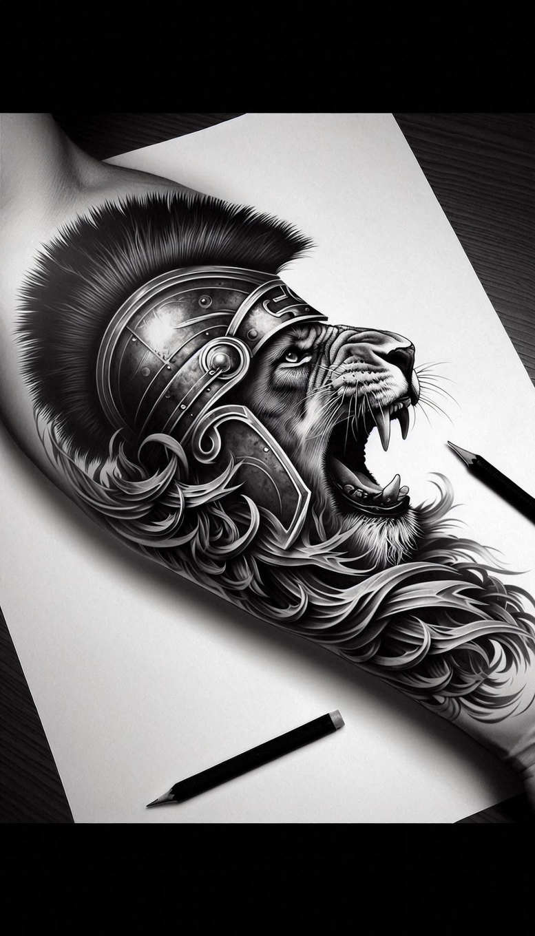 An audacious black-and-grey study of a tiger head emerging from the page, topped with a plated knight helmet that echoes medieval armor. Executed in a high-contrast grayscale, this tattoo design blends realism and stylized pattern work, with crisp line work and soft feathered shading along the fur and the sculpted metal plates. The helmet features rivets, a central crest, and ornamental scrolls that flow into the tiger’s mane, creating a sense of motion and power. The composition is designed to wrap along the shoulder or upper arm, with the ferocious mouth open in a roar, teeth bared, whiskers fine-tuned for drama. The surrounding negative space and curved lines help guide the eye from the helmet to the tiger’s gaze, enhancing the narrative of strength and fearlessness. In a symbolic sense, the tiger represents courage, guardianship, and raw predatory precision, while the knight’s helm hints at protection and chivalric duty, merging primal instinct with disciplined craft in a single tattoo design. The piece leans toward black and grey realism, suitable for bold, long-lasting ink with substantial coverage. Its dense blacks and mid-tones make it an excellent option for cover-ups, as the heavy shading can obscure previous marks while revealing a sharp new motif. This AI-generated tattoo project showcases meticulous precision and modern technique, reflecting current trends in custom tattoo design that emphasize technical prowess and striking contrast. The graphic patterns—the armor’s riveted plates and swirling flourishes—provide texture and depth, contributing to a pattern-rich composition that can be scaled for leg or back pieces. For clients seeking meaningful tattoos, the tiger-helmet motif communicates protection, courage, and transition, while the grayscale palette ensures compatibility with existing work or a fresh black and grey scheme. It also fits well within body art traditions and can be adapted to fine line tattoo or realistic tattoo styles, aligning with markets that crave premium ink and professional craftsmanship. As an AI-generated concept, it demonstrates how technology can inspire intricate explorations in fine line tattoo and realistic tattoo rendering, inviting discussion of placement, sizing, and personal symbolism.