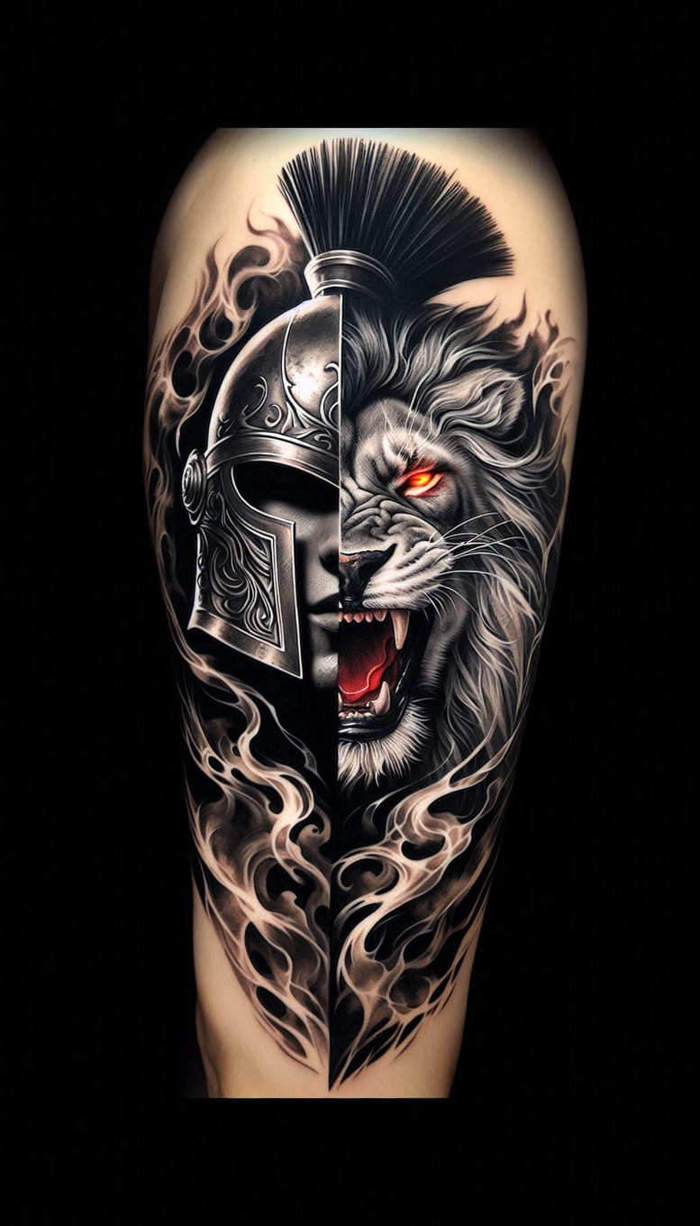 AI-generated tattoo project concept presents a striking split image that merges a knight’s helmet on the left with a roaring tiger on the right, divided along the arm’s contour and bound by curling flames. The helmet is rendered in polished metal with ornate engravings, subtle chisel-like reflections, and bold edges that convey medieval craft and protection. The tiger’s profile mirrors the same centering axis, with a snarling mouth, a piercing orange eye, and a textured mane in deep black and grey shading. The flames weave through the center, curling around the two halves to form a dramatic pattern that unifies the composition. The overall effect relies on dense black shading, crisp linework, and smooth gradient transitions to achieve a photo-realistic texture on skin. This piece is explicitly designed as a cover-up option: its high contrast, layered blacks, and heavy negative space enable masking of older ink or unwanted markings while remaining legible and impactful on a curved surface such as the upper arm or lower leg. The design skews toward realism, with meticulous attention to texture—metal gleam, fur softness, flame translucency—while maintaining a graphic silhouette that reads clearly from a distance. It nods to both Japanese style tattoo sensibilities and heraldic symbolism, presenting a timeless narrative of duality: protection versus ferocity, man versus beast. For clients seeking a meaningful tattoo design with bold black and grey ink, this concept offers a custom tattoo design that is scalable to a full sleeve and adaptable for pattern-rich surfaces. As an AI-generated tattoo project concept, it showcases how algorithmic artistry can deliver detailed, pattern-embedded composition that remains flexible for color accents or additional motifs if desired.