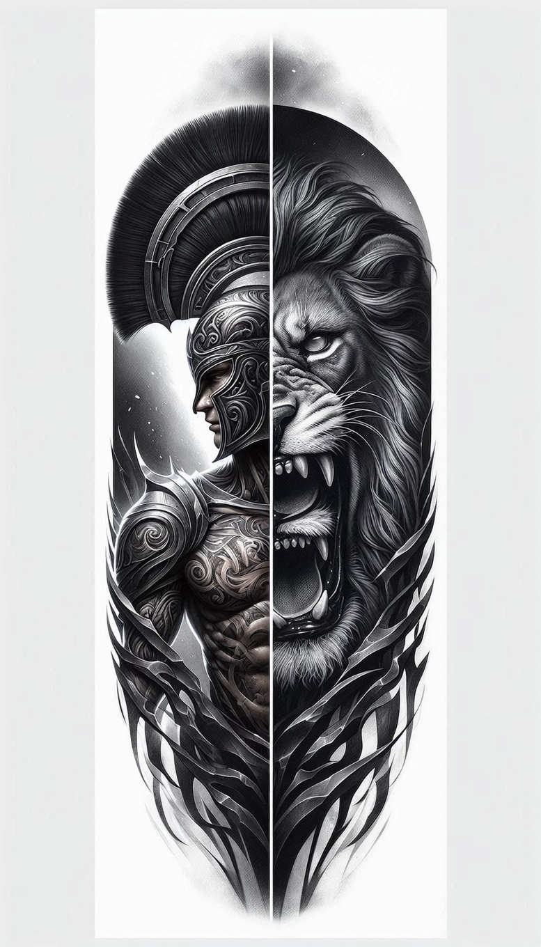 AI-generated tattoo project presents a dramatic split composition that pairs a disciplined ancient warrior with a feral predator. The left half depicts a heavily armored figure wearing an intricately sculpted helmet and ornate cuirass, with a circular shield forming a halo-like backdrop that guides the eye toward the transition where armor textures meet the feral contours of a lion on the right. The lion’s mane flows into the negative space while jagged, plant-like motifs emerge along the bottom edge, creating a strong vertical contrast that anchors the design. Rendered in black and grey with high-contrast shading, the piece relies on fine line work and meticulous engraving patterns on the helmet and breastplate to evoke classical warrior iconography. The right side emphasizes the lion’s ferocity: bared fangs, a tension-filled snout, and a piercing gaze that balances the warrior’s calm resolve. The split composition invites interpretation about duality—courage and ferocity, order and wild power—making it a meaningful tattoo design with rich storytelling potential. The grayscale realism emphasizes depth through layered gradients, while armor filigree and the lion’s fur showcase controlled line work that reads clearly at tattoo scale. In the context of meaningful tattoos and custom tattoo design, this piece works as a bold centerpiece or dramatic cover-up for existing work due to its dark values and strong silhouettes. As an AI-generated tattoo project, it demonstrates how digital concepting translates into ink-ready body art, aligning with trends in black and grey realism, pattern-driven engravings, and symbolic storytelling. The motif set—warrior, helmet, lion, shield, armor, vines—ensures the design remains legible and distinctive across medium-to-large formats, while the composition’s symmetry and negative space preserve balance on the chest, back, or sleeve.