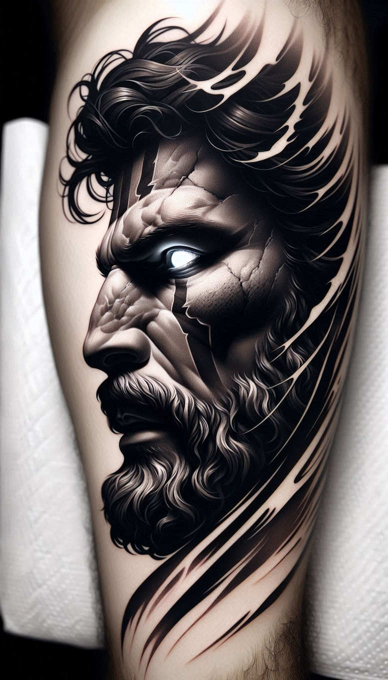 Emerging from the negative space of a muscular limb, this black and grey portrait centers on a bearded man’s head crafted like a carved bust, its features defined with chiseled lines and bold sweeping strokes that evoke shattered sculpture. The tonal range shifts from raven blacks to pale bone-grey highlights, creating depth and weight while maintaining a cohesive, skin-friendly surface. The face is rendered in a three-quarter view, with a strong brow, a piercing gaze suggested by a pale eye, and a tightly knotted beard executed with precise, follicle-like linework. Flowing ribbons of shading extend from the crown to the jaw, forming dynamic curves that mimic wind, motion, or smoke while preserving a bold silhouette on the skin. Cracks traverse the temple and cheek, as if the image were a stone relief fractured by time, adding texture and a narrative layer that invites interpretation. Whether produced by hand or generated through software, the technique blends smooth gradient transitions with crisp edgework to distinguish hair, skin, and stubble, allowing lighter skin tones to advance where crack lines recede. This is an AI-generated tattoo project, and the result is a striking, cover-up-ready piece that can conceal prior ink while delivering a powerful personal symbol. The composition leverages high contrast and negative space to ensure legibility on forearms or calves, and its fusion of stone-like texture with flowing contours and micro-shading makes it versatile for a larger sleeve or a focused standalone work. Beyond visual drama, the design speaks to resilience and memory, presenting a timeless, mythic figure whose stern gaze confronts the viewer with quiet authority. For clients seeking a bold statement that remains adaptable to different skin tones, this black and grey tattoo design offers meaningful tattoo potential and a realistic approach to body art, ink, and storytelling, while clearly signaling its suitability as a cover-up if needed. The piece also demonstrates how modern tattooists blend realism with stylized pattern work to create a memorable, durable image that rewards close inspection of linework and texture.