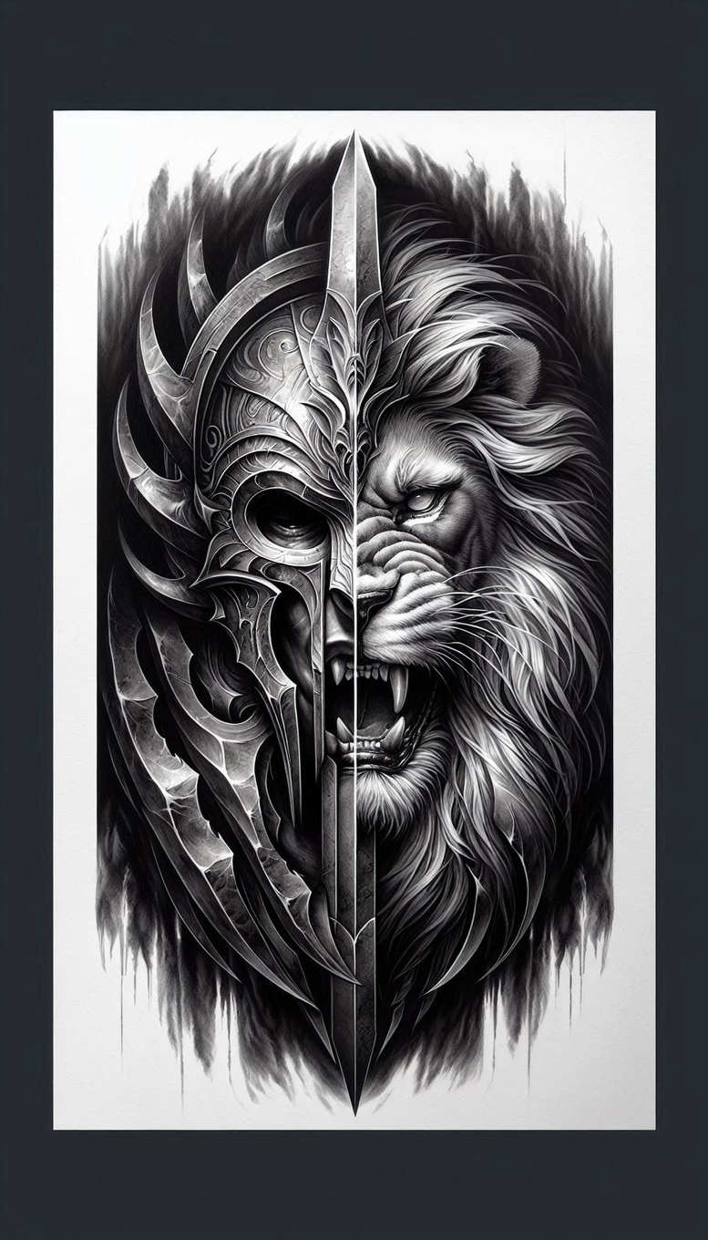 This black and grey tattoo design presents a striking juxtaposition: on the left, an intricately etched armor mask carved from interlocking plates and spiked extensions; on the right, a lifelike lion head surging with muscle, tension, and a flowing mane. Executed entirely in grayscale, the piece relies on dense linework, sharp edge work, and deliberate shading to achieve a high-contrast composition that reads as a cohesive, stand-alone image or as a dramatic centerpiece when expanded into a larger sleeve. The vertical split emphasizes dual symbolism—the mask evokes mystery, protection, and a warrior ethos, while the lion embodies courage, leadership, and raw power—making it a meaningful tattoo design for those seeking personal narratives in ink. The pattern-rich mask showcases interwoven blades and filigree textures that add a graphic, almost armor-like pattern against the organic texture of the lion’s fur, creating a dynamic contrast between rigid geometry and natural anatomy. From a technical perspective, expect precise stencil-ready outlines, careful gradation in the lion’s mane, and metallic-looking highlights on the mask achieved through controlled black ink density and smooth transitional shading. The piece aligns with black and grey realism and nods to Japanese style tattoo precision while embracing contemporary fantasy elements that make it suitable for a custom tattoo design project, a bold statement for small tattoos aspiring to grow into larger body art. As an AI-generated tattoo project, it exemplifies how advanced linework and shading can be harnessed to craft meaningful tattoos, while also offering strong cover-up potential for darker underlying ink, given the dense black areas and strategic negative space that allow existing marks to be camouflaged and redefined. In short, this is a pattern-rich, high-contrast design that communicates power and protection through symbolic imagery, with practical versatility for clients seeking a lasting, impactful black and grey tattoo.