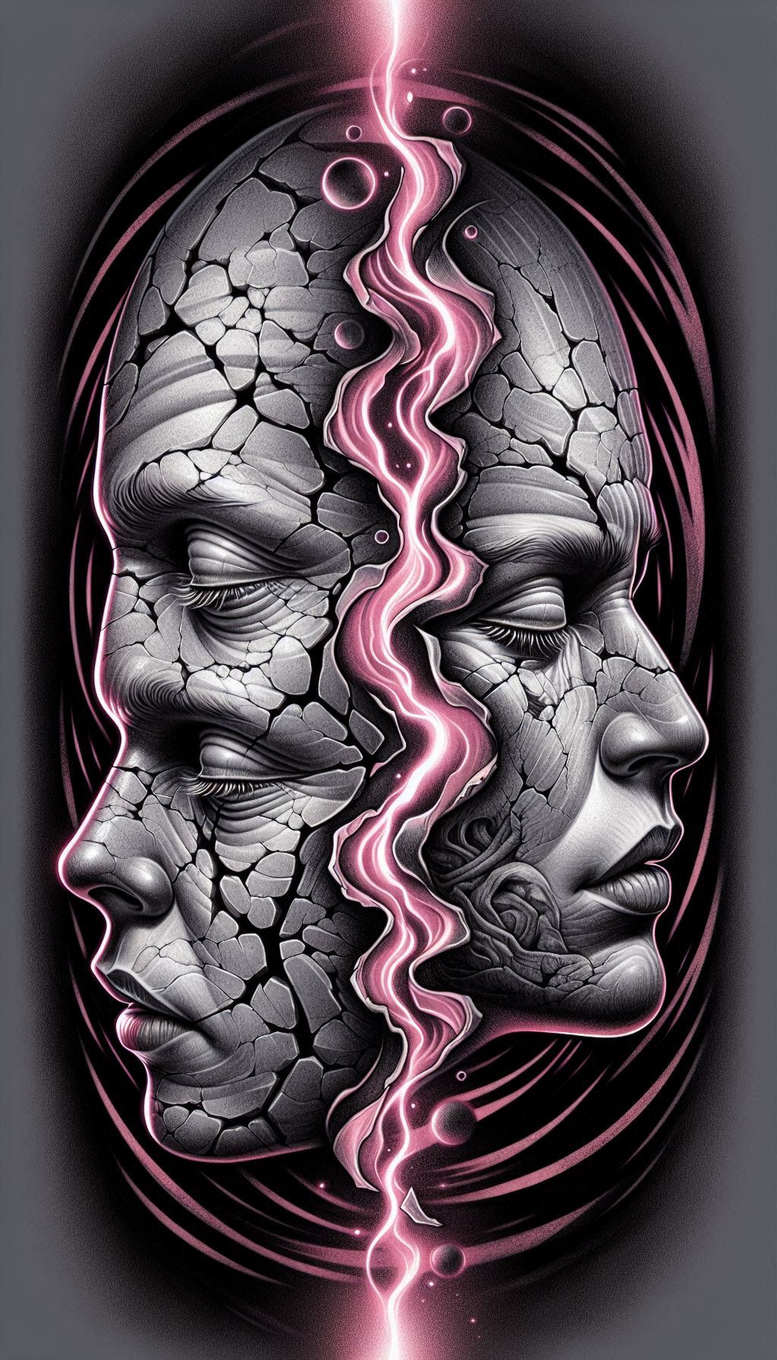 This AI-generated tattoo project presents a bold, dual-portrait concept: two grayscale faces formed from a fractured stone surface, facing opposite directions and bisected by a neon pink fissure that runs from crown to chin. The left profile is rugged, with a sculptural, cracked-marble texture, while the right profile remains smoother but still hints at stone beneath skin, creating a powerful dialogue between permanence and change. A sinuous neon line traces the vertical crack, weaving around circles and eddies of energy that frame the heads, adding a contemporary pop of color to the black-and-grey foundation. Surrounding arcs swirl around the silhouette, giving movement and a mandala-like balance that nods to modern graphic tattoo design while preserving realistic facial features for readability as a tattoo. The piece relies on careful black and grey shading, with crisp line work and smooth gradations to preserve detail at large scales, while allowing fine-line accents where the stone meets skin. The concept is versatile for a back piece, chest or sleeve, with scalable line weights and shading options to suit different body areas and skin tones. Symbolically, it speaks to resilience and duality, transformation and inner strength—an ideal canvas for meaningful tattoos and custom tattoo design. Given its dark values, the design also functions well as a cover-up, as the craggy texture can mask older ink beneath, and the luminous pink crack provides a modern focal point. AI origin: this is an AI-generated tattoo project intended for portfolios and client presentations, illustrating how graphic patterning and photorealistic shading can coexist in a single composition, and it can be adapted into various styles from ultra-realistic to stylized geometric. Keywords include tattoo, tattoo design, meaningful tattoos, fine line tattoo, lotus flower tattoo, infinity tattoo, tribal tattoo, rose tattoo design, small tattoos, flower tattoos, custom tattoo design, Japanese style tattoo, black and grey, realistic tattoo, body art, ink.