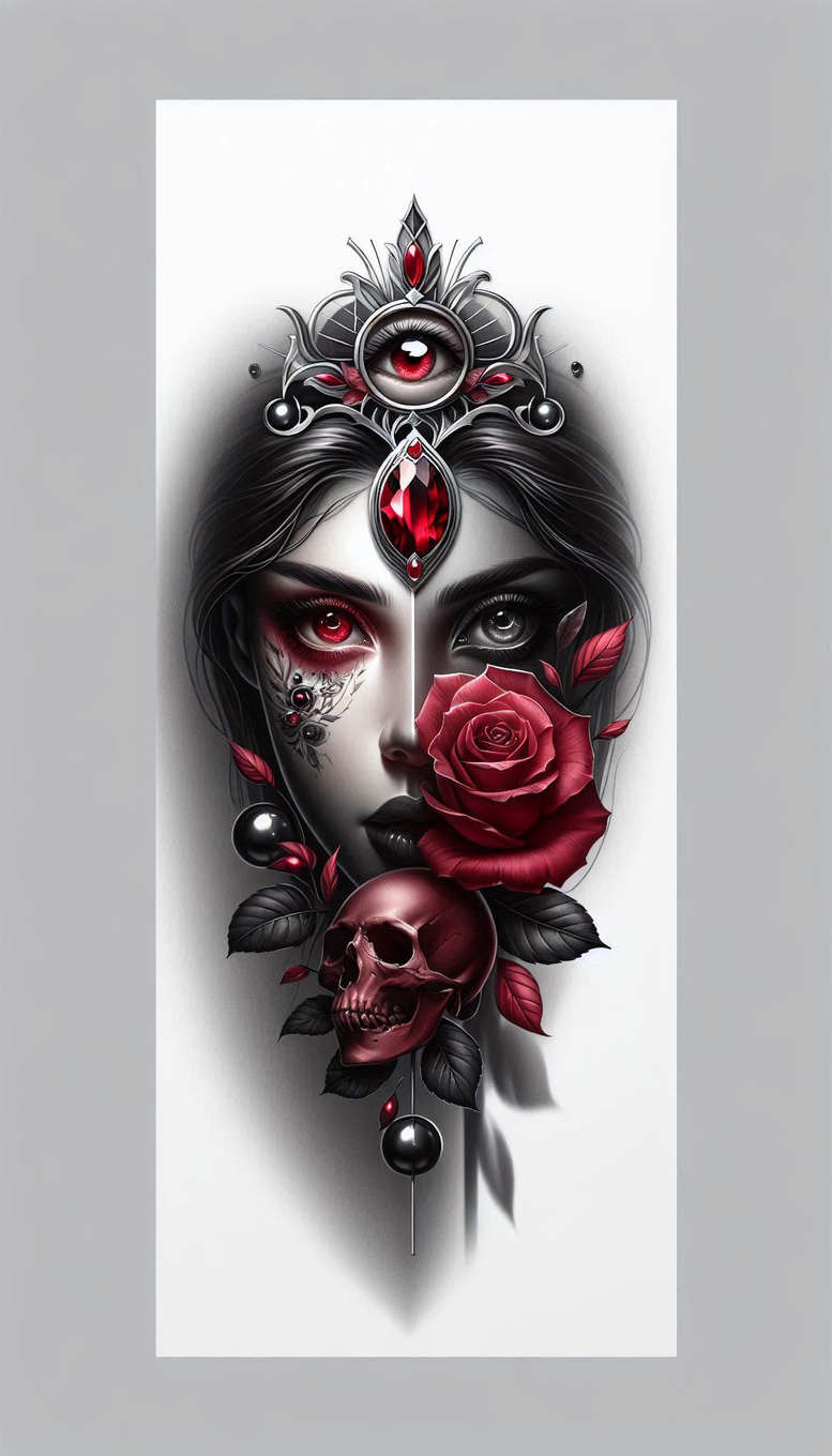 This AI-generated tattoo project presents a Gothic Queen cover-up concept rendered as a realistic black-and-grey study punctuated by bold red accents. The central image is a female visage bisected along the vertical axis, one side tinted with crimson around the eye, the other rendered in smooth grayscale, embodying duality and mystery. A crown rises above the brow, featuring intricate filigree, a central ruby-like gem, and ornamental motifs that echo the symmetry of the composition. A prominent red gemstone pendant sits along the midline, followed by a stylized rose on the right side and a dark skull tucked beneath the foliage, creating a striking tension between life and death. Leaves, stems, and small spheres thread through the design, reinforcing a sense of movement and depth. The execution relies on refined shading, soft gradients, and crisp line work to achieve a polished, photo-realistic look suitable for large-scale body art. The piece utilizes black and grey ink with selective red highlights to emphasize focal points, while the rose and skull anchor the narrative of transformation and mortality. Patterned ornamentation around the crown and along the edges adds a cohesive, almost jewelry-like quality, reminiscent of Japanese style tattoo lineage through meticulous line density and gradation, even as the overall mood leans toward gothic fantasy. This design is ideal for an ambitious client seeking a meaningful tattoo design that can function as a cover-up for older ink, given its dense shading, bold negative space, and layered imagery that can seamlessly obscure prior work while preserving a powerful visual story. The tattoo design communicates themes of resilience, beauty in decay, and the interplay between light and shadow, making it a strong candidate for meaningful tattoos and fine-line technique exploration, while also offering opportunities for customization in color balance or shading. For collectors of small tattoos and larger back pieces alike, this concept delivers a statement piece that blends realism with stylized ornament, suitable for black-and-grey realism or color overlays, and invites the wearer to explore a custom tattoo design that remains anchored to classic motifs such as the rose, the skull, and the crown. In short, this is a compelling, AI-originated tattoo project offering a cover-up-ready, pattern-rich composition with timeless symbolism and modern technical polish.