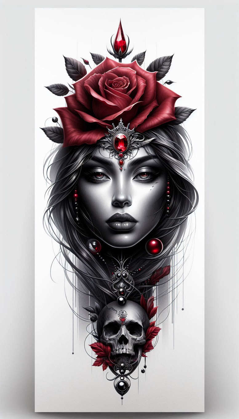 An AI-generated tattoo project rendered in black and grey with crimson accents, this piece centers a woman’s grayscale portrait crowned by a large red rose and ornate jewelry, with a skull motif beneath. The composition blends hyper-realistic shading of the face with decorative line work around the crown and pendant, creating a bold, tattoo-ready design that reads well at large scales. The rose crown sits dominant atop the head, with ruby-red gems, a jeweled centerpiece, and flowing strands that echo down toward a stylized skull anchored by intricate metalwork. The high-contrast grayscale skin tones sculpt the features, while selective red highlights draw attention to the crown, gems, and the skull’s details, producing a dramatic focal point across the composition. The piece employs a mix of realism and ornamental patterning, invoking vibes of tribal and Japanese-inspired tattoo motifs without losing a contemporary, fine line tattoo feel. Symbolically, the rose stands for beauty and passion, the skull for mortality, and the jewelry linking elements signify fate and protection; together they weave a story suitable for a meaningful tattoos collection, including terms like rose tattoo design, infinity tattoo, and custom tattoo design. The design is ideal for a cover-up due to its dense linework, strong contrast, and ability to mask older work beneath the portrait, while still offering flexibility for placement across the back, chest, or sleeve. As AI-generated tattoo projects become more prevalent, this concept demonstrates how digital illustration can translate into realistic tattoo design with professional magazine-ready details and scalable line quality, maintaining a modern aesthetic that can inspire clients seeking dramatic, statement pieces with a pattern-rich vocabulary and a bold black and grey palette.