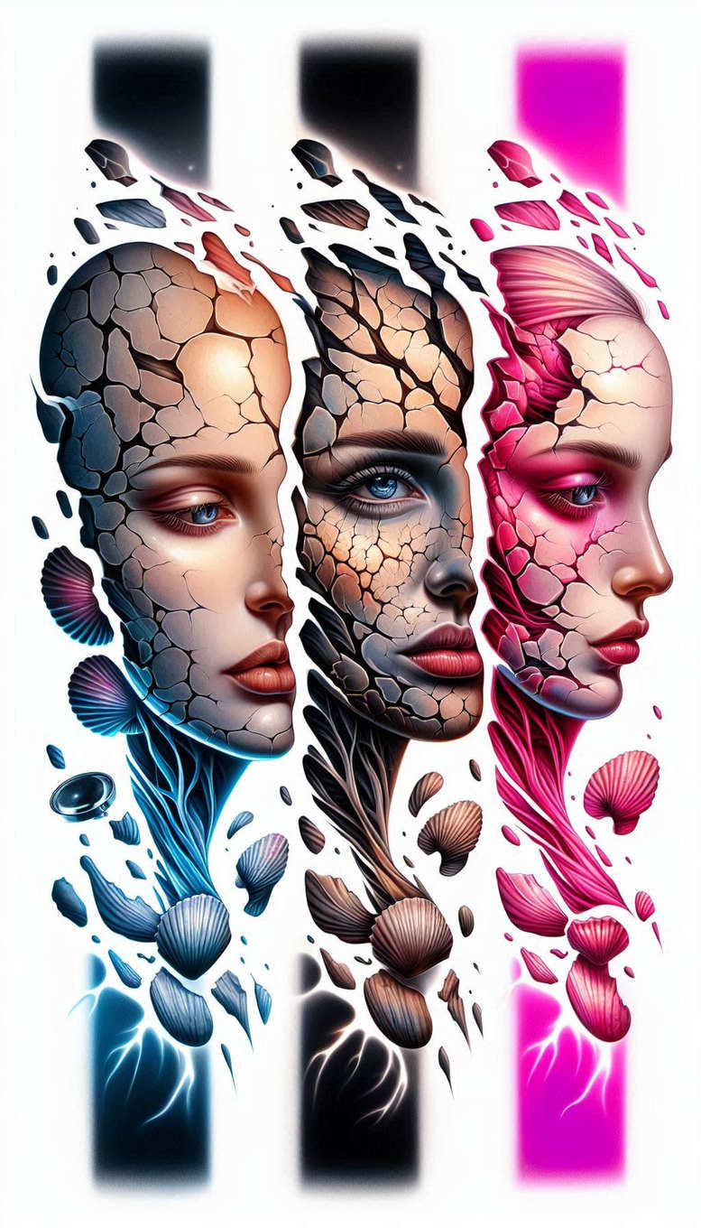 AI-generated tattoo project presenting a surreal triptych of portraits whose skin appears fractured into irregular plates. The left face reads cool blue-gray, the center browns and ochres, and the right profile blazes in pink and ivory. The cracked-earth pattern dominates the surface, with jagged fissures catching light and creating convincing depth across skin, while shells embellish the lower edges to anchor the scene. The technique blends realism in shading of eyes and lips with crisp, graphic edges where the plates detach and reassemble, producing a hybrid of realism and illustration that reads strongly as a tattoo design. Color is central here, guiding the eye across the triptych and suggesting wraparound potential for sleeves or chest panels; the palette moves from cool to warm to create visual rhythm and to facilitate integration with existing ink. Symbolically, the fractured skin hints at resilience, metamorphosis, and renewal, hinting that broken pieces can form a stronger whole when brought together. From a practical tattoo design perspective, this concept offers meaningful tattoos with bold color work suitable for large formats; the pattern is dominant, adaptable to a Japanese style tattoo influence, tribal textures, or delicate fine line accents for a lighter version on smaller scales. The work demonstrates how AI-generated tattoo projects can inspire contemporary body art by translating a graphic fracture motif into dynamic skin texture, and it invites tattoo artists to experiment with color, light, and negative space while maintaining legibility on the skin. It is a rich source for meaningful tattoos and custom tattoo design concepts that can evolve into full sleeves, back pieces, or chest panels, leveraging ink, pattern, and color to tell a resilient narrative.