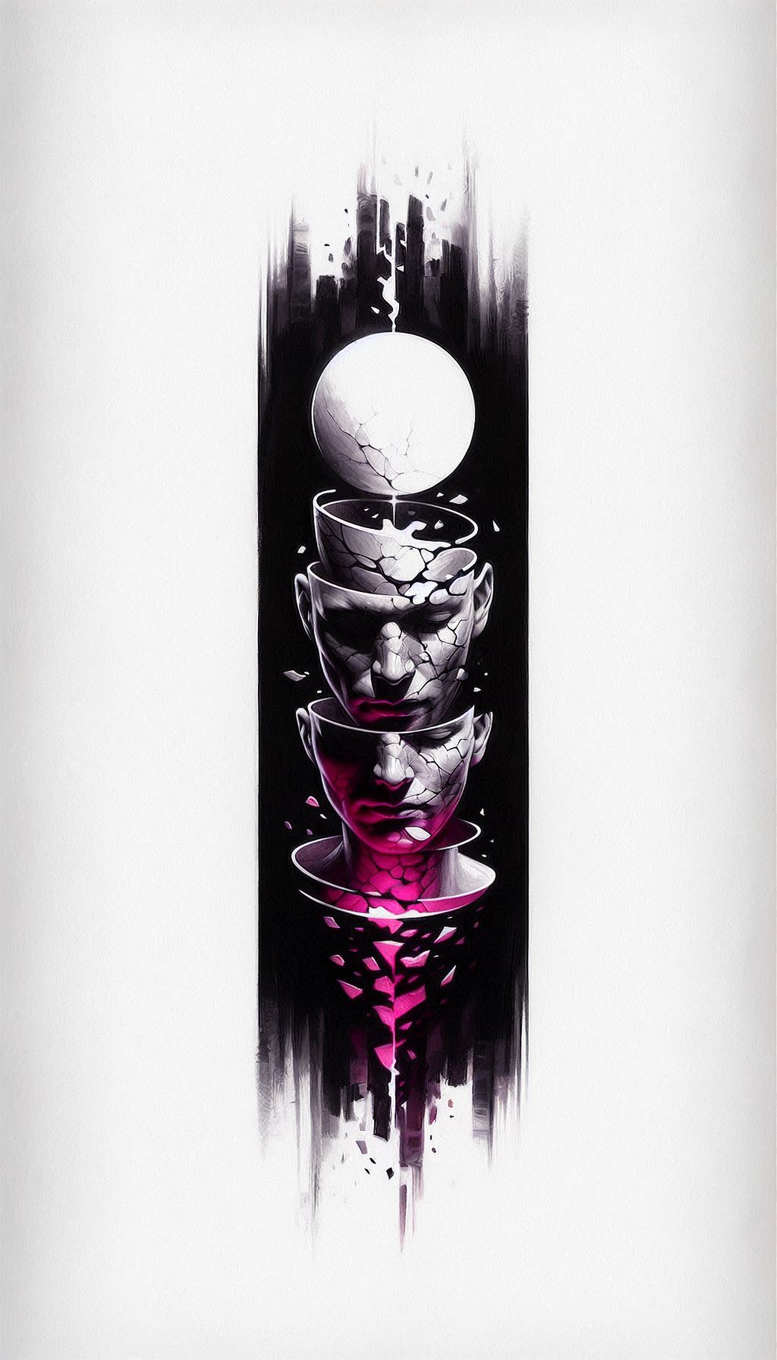 This AI-generated concept presents a bold, surreal composition built from fractured, ceramic-like faces stacked along a central vertical axis, crowned by a luminous sphere at the top. The design plays with negative space and a high-contrast black and grey palette, with magenta-pink accents that trace the cracks and edges of the faces, creating a striking, almost mosaic-like texture. The faces appear as separate but interlocked elements, each fractured into polygonal fragments that drift into rings around the neck, forming a tonal chain that grounds the piece while amplifying the sense of motion and transformation. The sphere above adds a celestial counterpoint, its smooth surface contrasting with the jagged planes of the faces, suggesting themes of enlightenment, unity, or inner fragmentation. The central column emerges from a dark, painterly backdrop that sharpens the figures and isolates them as a tattoo-ready silhouette. The composition relies on clean line-work and controlled shading to render the contours, while the pink highlights provide a modern, graphic pop that makes this piece suitable for a bold coverage. Symbolically, the stacked heads can be read as layered identities or evolving personas, with the cracks signaling impermanence and resilience in the journey of self-expression. For tattoo enthusiasts searching for a meaningful design, this concept blends fine line technique with a contemporary, pattern-rich aesthetic suitable for large or small areas. As an AI-generated tattoo project concept, it exemplifies how digital artistry translates into transferable body art ideas, offering a unique option for those considering a cover-up or a statement piece in black and grey with selective color. Keywords such as tattoo, tattoo design, meaningful tattoos, fine line tattoo, lotus flower tattoo, infinity tattoo, tribal tattoo, rose tattoo design, small tattoos, flower tattoos, custom tattoo design, Japanese style tattoo, black and grey, realistic tattoo, body art, and ink are woven into the description to position this concept within the broader discourse of modern tattoo culture.