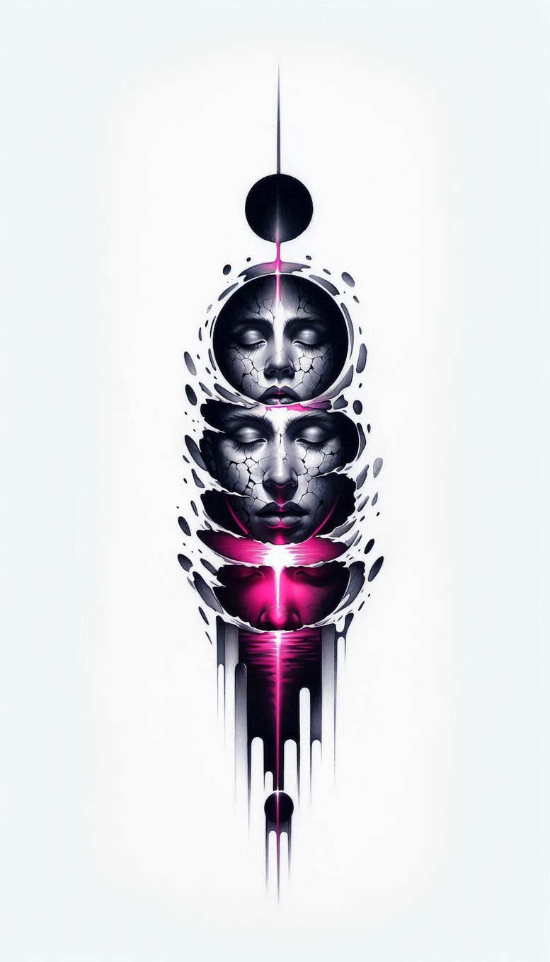 This piece presents a vertical arrangement of three grayscale faces whose expressions are softened by a crackled surface, as if carved from porcelain and then restored by color. The design relies on precise linework and layered shading to create depth, while a neon pink axis runs through the center, accenting the bridge between each visage and guiding the eye downward into a tapering, dripping column of ink. Circular halos around each face provide rhythm and balance, echoing mandala-like symmetry while remaining strongly contemporary. The cracks across the surfaces act as a graphic pattern, a time-worn map of resilience that contrasts with the smooth gradient shading and crisp outlines, rendering the piece both realistic and dreamlike. The lower portion detaches into elongated vertical drips that melt into the skin, a signature motion of modern tattoo design that invites close inspection and distance reading. The technique marries fine line precision with soft shading and careful gradient transitions, yielding a black and grey realism that sits between Japanese style tattoo discipline and Western geometric abstraction. Meaningfully, the stacked faces can be read as multiple facets of identity, memory, and renewal, making it suitable for a bold cover-up on a larger canvas for older ink or as a dramatic sleeve component. The pink accents serve as a contemporary signature, while the surrounding negative space keeps the composition airy and legible over time. This is an AI-generated tattoo project that reflects current trends in ink artistry and digital-aided concepting, yet remains anchored in classic tattoo language such as ink, line work, and body art. For practitioners and clients seeking meaningful tattoos, the piece offers a versatile template for custom tattoo design, small tattoos in a larger piece, or a striking standalone statement that communicates mood and metamorphosis. Its gravity, clarity, and symbolic charge align with ongoing circles of black and grey realism, fine line tattoo sensibilities, and the broader vocabulary of meaningful tattoos, from lotus flower tattoo and infinity tattoo references to floral motifs and restrained tribal cues, making it a forward-looking contribution to the discussion of tattoo design, technique, and the future of ink.