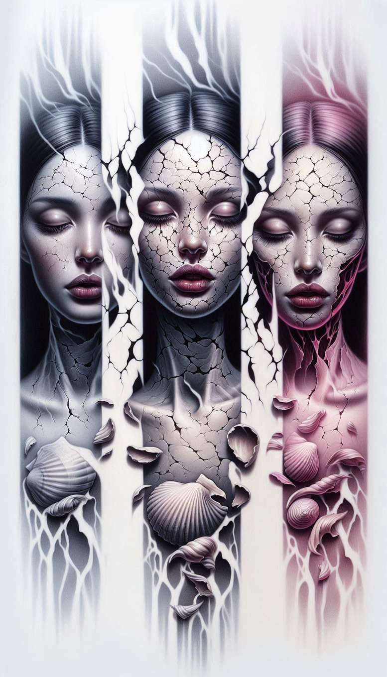 AI-generated tattoo project presented as a single study of surreal portraiture and natural motifs. The central image frames three female faces, their skin cracked like weathered porcelain, rendered with ultra-fine shading and soft gradients that create convincing depth. White vertical bars slice through the composition, producing a fractured window effect that unites the trio while preserving each face’s expression. At the base, seashells appear in muted grayscale with subtle pink undertones on the right, providing an organic counterpoint to the geometric separation above. The overall palette stays within black and grey with selective color touches, ensuring a cohesive tattoo-ready aesthetic suitable for black and grey ink. The piece emphasizes pattern through the network of cracks and shell motifs, giving the tattoo a rhythmic texture that translates well to skin. Technique-wise, the design blends smooth transitions with crisp line work to emphasize form and volume, achieving a balance between realism and dreamlike fantasy. The concept explores transformation, fragility, and renewal, with cracked skin suggesting endurance and inner resilience breaking through. The shells evoke shoreline symbolism, while the three faces can symbolize past, present, and future, or multiple facets of identity, offering meaningful tattoo design options for a personal collection. Given its AI-generated origin, this project demonstrates how algorithmic creativity can inspire contemporary meaningful tattoos and custom tattoo design ideas. The layout is adaptable for forearms, calves, or the back, with bars ensuring legibility at larger scales; for lovers of pattern-rich, dramatic body art, this piece works as a striking fine line tattoo concept or as a bold realism-inspired cover piece when needed.