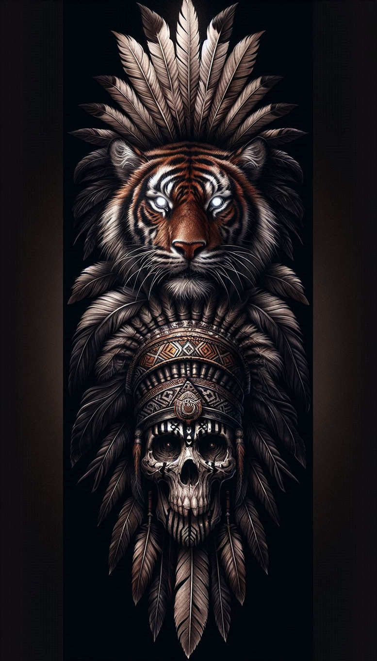 This is an AI-generated tattoo project concept presenting a bold fusion of wildlife, ritual symbolism, and graphic ornamentation. A powerful tiger head rises above a skull, both anchored by an ornate feathered headdress that fans out in dark, meticulous detail. The tiger’s gaze commands attention with crisp fur texture and subtle highlights, while the skull beneath carries an archaic rhythm through beads, etched patterns, and ceremonial motifs. The feather corona frames the composition, each quill rendered with careful shading to convey movement and depth. Executed in black and grey, the piece relies on tonal gradation, restrained linework, and smooth transitions to achieve a realistic tattoo feel. The overall silhouette is tall and vertical, making it a striking cover-up option for clients seeking to obscure existing ink with a bold, symbolic narrative. Symbolically, the tiger embodies strength and focus, the skull marks mortality and memory, and the feathered headdress adds cultural resonance and rhythm, weaving a story of courage, memory, and rite. The ornamental headpiece features geometric patterns and beadwork that introduce a graphic layer; this graphic pattern detail elevates the design into a contemporary tattoo concept while remaining rooted in traditional symbolism. From a technical standpoint, the design emphasizes black and grey shading, dense texture, and controlled negative space to produce a refined, dramatic tattoo design suitable for large placements on the back, chest, or sleeve. For clients seeking meaningful tattoos, this concept aligns with modern trends in tribal and Japanese-inspired motifs, while staying within the realm of fine line tattoo and realistic tattoo aesthetics. It is a carefully composed, AI-generated tattoo project concept—ready for refinement and transfer to skin. The cover-up potential is evident in heavy shading and high-contrast elements, which can obscure prior work and deliver a clean slate with lasting impact.