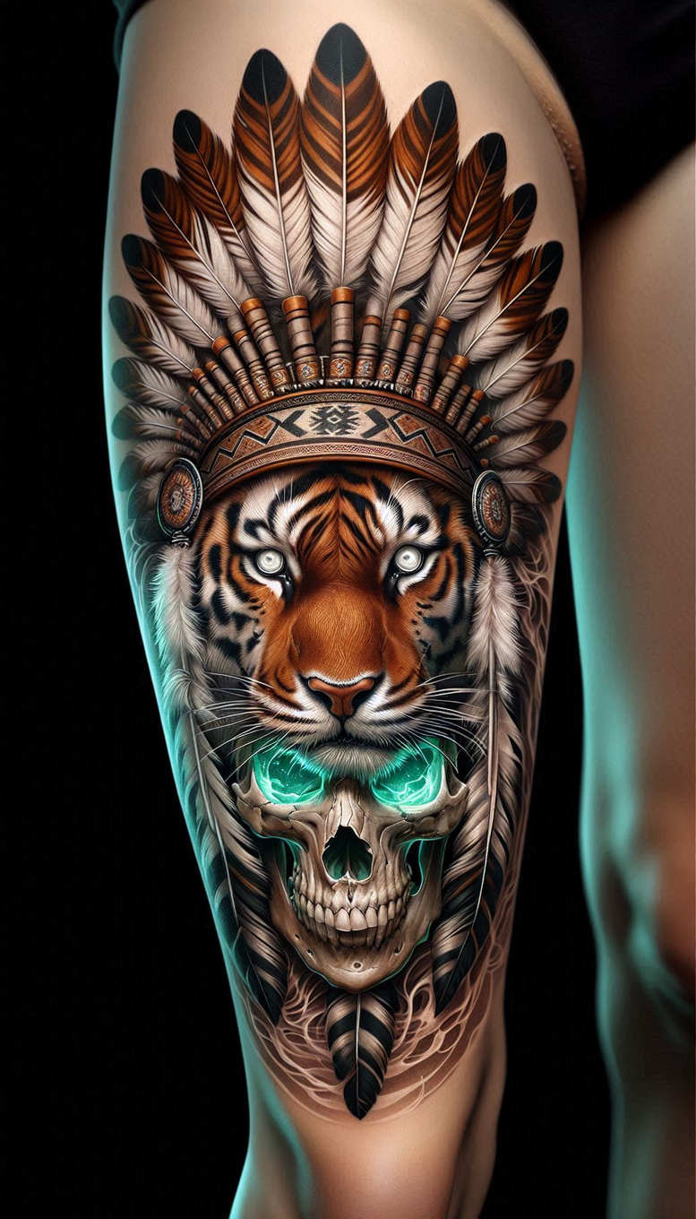 This AI-generated tattoo project presents a bold fusion of ferocity and ceremony: a tiger head set over a skull, crowned by a feathered Native American headdress. Rendered in rich full color with expert shading, the orange tiger fur, black stripes, and white highlights anchor the composition, while the skull beneath introduces mortality and resilience as counterpoint. The headband carries geometric motifs and beadwork, and the outward-spreading feathers form a crown-like halo that defines the silhouette for a sleeve or large forearm piece. A turquoise glow around the skull adds supernatural energy and helps separate foreground from the dark background, demonstrating skillful layering and color saturation that translate to tattoo ink with depth. The technique blends photorealistic rendering, smooth gradients, crisp linework, and subtle cross-hatching to convey texture—from fur to bone to fabric—without sacrificing readability on skin. The subject matter resonates with themes of power, courage, and life’s fragility, while the headband’s pattern hints at cultural symbolism when approached with care in a custom tattoo design context. This piece sits comfortably in the realm of realistic tattoo and body art, yet its tribal-tinged elements and graphic composition also suit modern, full-color or black-and-grey palettes depending on client preference. As a portfolio-ready concept, it benefits from scalable design cues that accommodate placement on the arm, calf, or shoulder, with potential refinements in scale, line weight, or contrast. Overall, the tattoo design fuses animal symbolism with ceremonial ornament to create a memorable, meaningful image that reads clearly at a glance and invites deeper personal interpretation. This is an AI-generated tattoo project illustrating how pattern-rich feathers and bold color blocks can inform a striking, contemporary tattoo design.