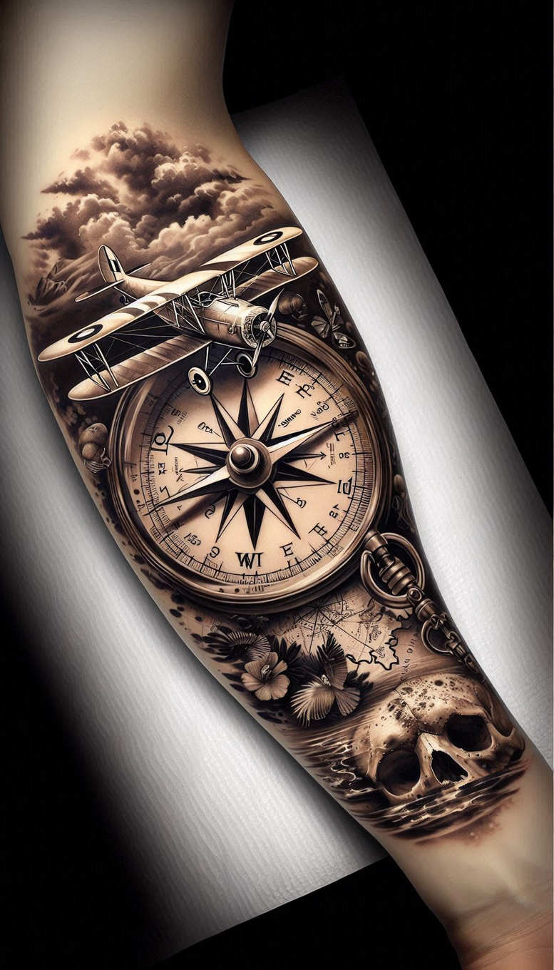 This is an AI-generated tattoo project presented in black and grey realism for a bold forearm sleeve. The central tableau features a vintage biplane flying over a compass rose, its metallic surfaces detailed with high-contrast highlights and soft grey washes that mimic aged brass and polished steel. Behind it, dramatic clouds roll across the sky while a curving map motif threads through the composition, hinting at distant routes. A skull anchors the lower forearm, shaded to convey bone and shadow, while tropical flowers bend around the edge, softening the linework with organic form. A delicate chain links the compass area to the surrounding design, adding a touch of vintage jewelry and movement. The tattoo uses dense black ink and gradual grey shading to create depth, with negative space reserved to suggest light catching on metal and glass, and to keep the piece legible as it wraps the limb. The compass serves as an emblem of direction and purpose, the airplane embodies travel and momentum, and the skull provides a sobering counterpoint that lends meaning to time and exploration. The flowers and clouds balance the rigid geometry with natural curves, while the map motifs imply journeys taken and those still ahead. For a client seeking a meaningful, long-lasting piece, this design offers a strong cover-up option thanks to its broad tonal range and cohesive grayscale gradient. As an AI-generated tattoo project, it demonstrates how algorithmic design can translate classic symbols into a cohesive, dramatic tattoo design suitable for a large forearm canvas, with careful attention to line weight, shading, and composition that tattoo artists can adapt to individual skin tones and movement.
