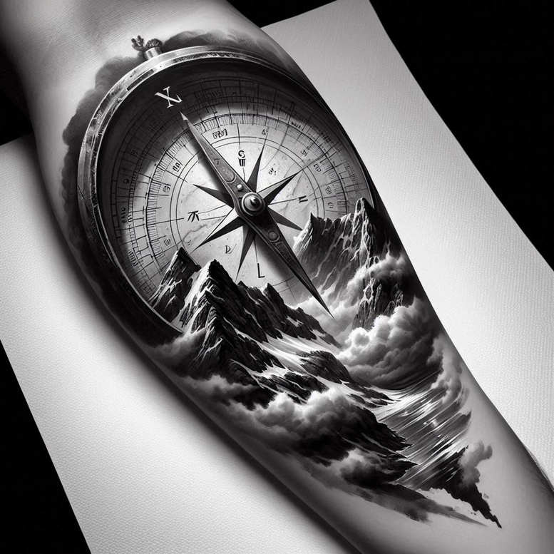 This tattoo design blends a precise compass motif with a jagged alpine landscape in black and grey realism, creating a bold, narrative piece for the forearm. At the center sits a traditional compass rose, its cardinal directions etched with crisp line work while the needle points toward unseen horizons. A range of rugged mountains unfolds below, their peaks carved with sculpted shadows and subtle gradient transitions that capture the texture of rock and snow. Surrounding wisps of cloud coil around the summits, adding atmosphere and depth, while negative space along the periphery preserves breathing room and enhances the legibility of the central image. The artist employs a mix of fine line detailing for the compass and broader shading for the mountains, using cross-hatching and smooth feathering to achieve a three-dimensional effect. The composition relies on strong geometric geometry—the circular compass shadowed against the jagged skyline—to produce a balanced silhouette that reads clearly on the canvas of skin. Symbolically, the compass signifies direction and purpose; the mountains embody challenge and ascent; the clouds suggest transience and freedom. This piece fits squarely within styles of black and grey tattoo and realistic tattoo traditions, while retaining a modern edge through meticulous line weight and careful contrast. As an AI-generated tattoo project, the design is highly adaptable to different arm sizes and can be adjusted for line density or scale. Given its dense blacks and layered tones, it is particularly well suited as a cover-up option for concealment of older tattoos or scars. This work embodies the search for meaning and journey—a meaningful tattoo choice for those drawn to travel, resilience, and precise, dramatic ink. It touches on themes of exploration and endurance, and its monochrome palette reinforces timeless appeal in the realm of ink.