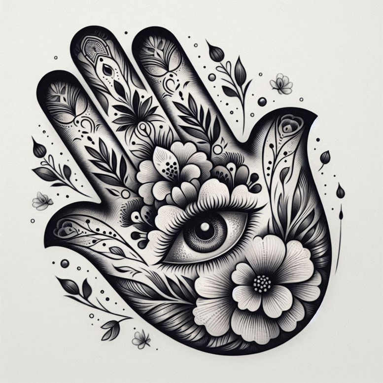 This AI-generated tattoo project concept presents a bold black-and-grey fine-line design that fuses a hand silhouette with an eye centered in the palm, surrounded by intertwining florals and leaves. The composition relies on crisp linework, delicate shading, and negative space to create depth while maintaining a cohesive, ornamental feel. The hand motif evokes protection and guidance, while the all-seeing eye can symbolize awareness, intuition, and inner vision. Floral elements weave through the fingers and palm, forming a botanical frame that can scale from a small tattoo to a larger body-art piece. Emphasizing the fine-line approach, the piece supports delicate tones and precise contours, suitable for realistic or stylized interpretations depending on skin tone and artist preference. The design is ideal for black and grey palettes and can be customized in line weight, shading density, and the number of flowers to fit anatomy and meaning. As an AI-generated tattoo project concept, it offers a flexible template for a unique custom tattoo design that works on the forearm, wrist, or hand with the palm-centered focal point translating across skin textures. The floral pattern provides organic movement and a timeless aesthetic aligned with flower tattoos and modern line work. The symbolism invites interpretation—protection, perception, growth, and resilience—while the overall silhouette remains bold yet refined, a strong candidate for a cover-up given high-contrast areas and dense shading. For tattooers, this design delivers an efficient workflow: clean line definitions, scalable motifs, and clear shadows for consistent reproduction as a small tattoo or large statement piece. In short, this is a versatile, meaningful tattoo design idea ideal for those seeking a striking black-and-grey artwork with pattern-rich florals ready for a cover-up.