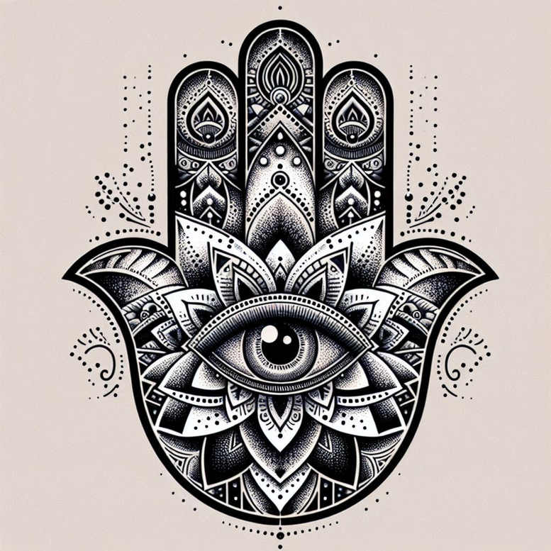This AI-generated tattoo project presents an intricate Hamsa hand rendered in black and grey linework, combining symbols of protection with meditative geometry. The central palm features a detailed eye, an all-seeing symbol long associated with awareness and guardianship, surrounded by a layered mandala of petals and geometric motifs. The lower hand reveals lotus-inspired petals, suggesting renewal and growth amid the talismanic form. The entire design relies on fine-line technique, with deliberate dotwork shading building depth and texture across the hand’s lobes and fingertips. Lotus accents weave into the composition, adding a sense of serenity and renewal within the talismanic silhouette. The piece emphasizes symmetry and repeating motifs to create a dense, wearable artwork that reads clearly in both small and large scales. From a technical perspective, crisp outlines are paired with dotwork gradients and controlled negative space to simulate texture and curvature on skin. The symbolism blends protection (Hamsa), sight (eye), spiritual growth (lotus), and circular harmony (mandala), yielding a tattoo design with layered meaning suitable for meaningful tattoos, flower tattoos, and custom tattoo design projects. This design showcases the versatility of black and grey ink, demonstrating how fine-line tattoo artistry can deliver intricate detail while maintaining legibility over time, and it stands as a strong example of a meaningful tattoo concept that can be adapted for Japanese style influences or tribal-inspired interpretations if desired. As an AI-generated tattoo project, it invites contemplation on how algorithmic processes translate sacred iconography into contemporary ink, offering a template for future custom tattoo design that respects heritage while embracing modern aesthetics. For potential cover-up considerations, the dense geometry and bold outlines can be tailored to blend with or obscure existing work when planned with a skilled tattoo artist, making it a flexible option for cover-up-oriented projects.