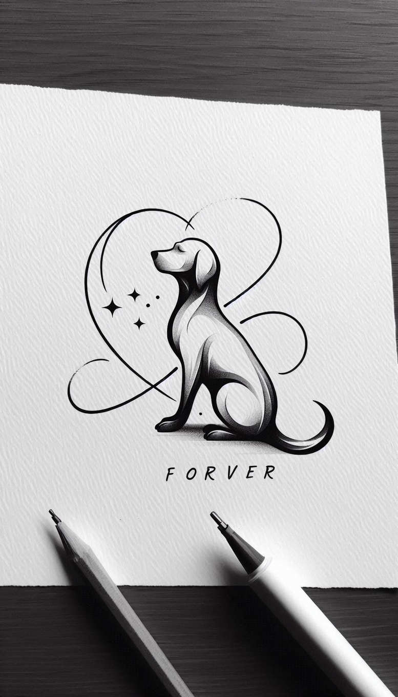 AI-generated tattoo project concept rendered as a black and grey line illustration of a dog in a seated pose, with a looping heart behind and a cluster of stars. The design uses bold contours combined with soft gradients to produce depth on a flat paper surface, as if the sketch is ready to transfer to skin. The image is presented on textured white paper, with a pencil and a marker pen visible at the bottom, underscoring the artist’s workflow from concept to potential tattoo. Central to the composition is the dog’s silhouette, which relies on clean line work and measured shading to keep legibility when scaled for small or large placements. The heart motif frames the figure and adds a sense of devotion, while the star accents convey wonder and permanence, complementing the inscription FOREVER that anchors meaning for meaningful tattoos, pet memorials, or personal vows. This tattoo design is suitable for various applications: it can be refined into a refined fine line tattoo, converted into a black and grey piece, or expanded with additional elements such as floral motifs, tribal lines, or Japanese-style embellishments to suit different styles. For clients seeking a memorial or a symbol of loyalty, the concept offers a versatile template that can be adjusted for size, line weight, and shading intensity to achieve a clean transfer on skin. If used as a cover-up, the solid silhouette and negative space can accommodate overlaying tattoos, while the heart and stars can be adapted to fit over existing marks. As an AI-generated tattoo project concept, it demonstrates how digital drafts translate into real-world ink with precise line consistency and durable pigment, aligning with trends in tattoo design and body art. The design embraces meaningful tattoos, and can be tailored into a lotus flower tattoo or infinity tattoo to broaden its symbolism. It also functions as a solid foundation for a custom tattoo design, adaptable to Japanese style tattoo influences or realistic black and grey execution depending on client preferences. This concept ultimately serves as a starting point for a bespoke tattoo that honors loyalty and memory while offering flexibility for scale, detail, and personal meaning.