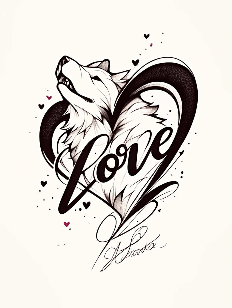 This AI-generated tattoo project presents a bold line-work study: a wolf head framed by a heart, with the word Love rendered in elegant script and a scattering of small hearts. Executed in clean black ink on a pale canvas, the composition relies on confident outlines and restrained shading to create depth without sacrificing readability, a hallmark of fine line tattoo design. The wolf, a symbol of loyalty, courage, and guardianship, is captured in a stylized silhouette that intersects with a heart motif, suggesting a fusion of wild instinct and tender emotion. The script Love forms the central axis of the piece, its looping lines weaving through the heart contours and guiding the eye along the composition, while the delicate signature flourish at the bottom adds a personal touch. Tiny hearts, stippling, and dot accents orbit the main imagery, providing subtle movement and a sense of whimsy that adapts to small to medium tattoo sizes. From a technique perspective, the piece relies on sharp black outlines, soft shading for dimension, and a clean, uninterrupted flow of line weight that reads well as black and grey ink; it also nods to Japanese-style tattoo influences through its disciplined composition and elegant script. While the concept nods to contemporary tattoo trends, it remains a timeless design suitable for meaningful tattoos, small tattoos, or a larger body art piece. As an AI-generated concept, it offers a modern interpretation of a classic love-and-wolf motif, ideal as a starting point for a custom tattoo design that can be adjusted for color versions or scale without losing its crisp line work. This design suits ink-focused collectors seeking a tattoo design that balances symbolism with legibility, making it a versatile option for forearms, shoulders, chest, or back.