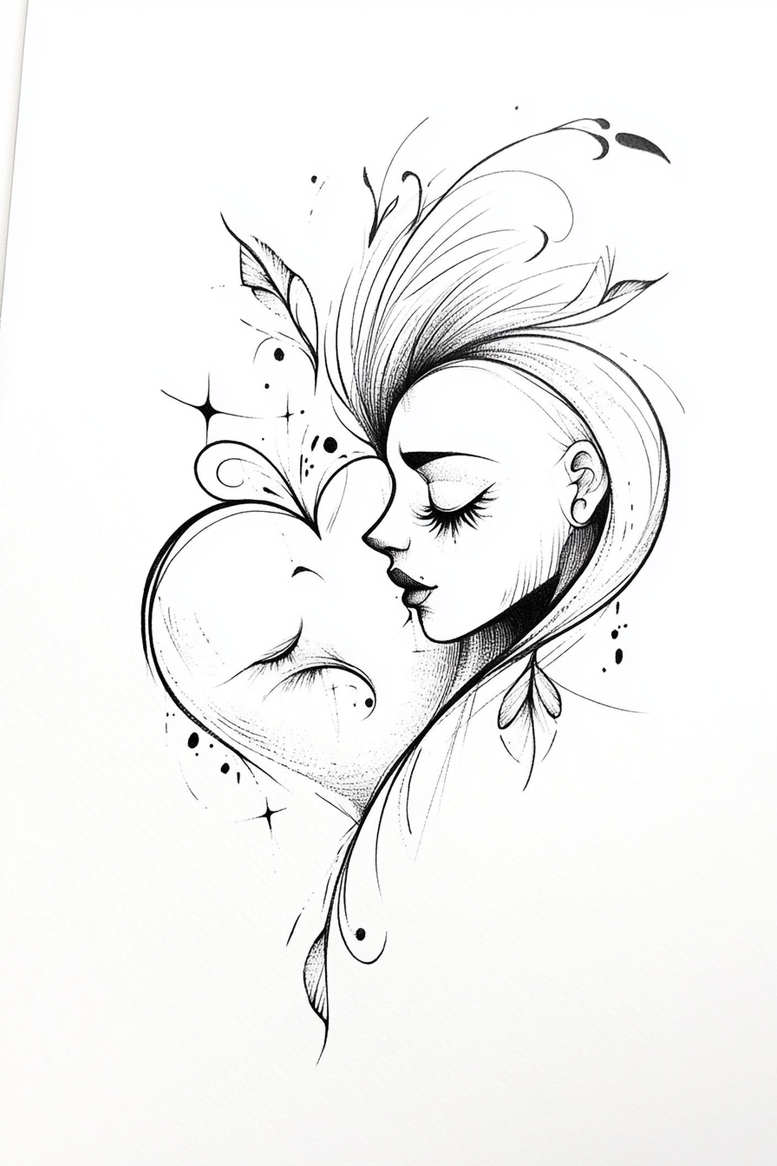 This is an AI-generated tattoo project concept. Rendered in black and grey with fine line technique, the design centers on a profile of a woman as she leans to kiss a heart. The heart is stylized with curved lines that flow into the woman’s neckline and flowing hair, creating a cohesive silhouette. Decorative swirls and scatter marks give the piece a subtle pattern-like rhythm, enabling versatility for small tattoos or larger back or sleeve configurations. The artwork relies on crisp lines, balanced line weights, and soft shading to convey depth without overpowering the composition. Symbolically, the kiss and heart speak to affection, commitment, and unity, while the continuous line style echoes a sense of connection and movement that is often pursued in meaningful tattoos. From a technical perspective, the concept emphasizes negative space to preserve readability on compact canvases and to ensure clean replication on skin. The piece can be adapted to incorporate Japanese style tattoo or tribal influences, or integrated with floral elements such as lotus flowers or roses for a custom tattoo design. It is suitable for black and grey ink and offers flexibility for small tattoos, medium pieces, or larger body art projects. As a potential cover-up, the design’s open spaces and defined outlines can blend with or conceal prior marks while preserving a delicate aesthetic.