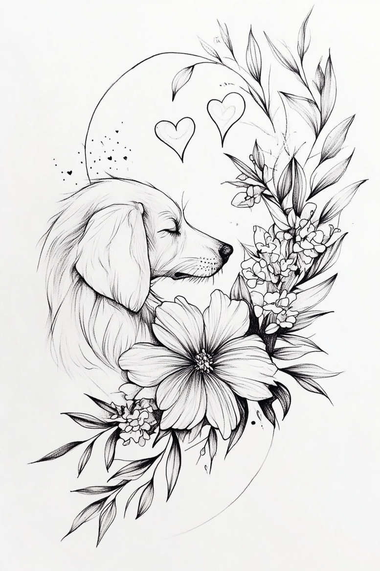 This tattoo design presents a lifelike dog portrait framed by a botanical crescent of blossoms and leaves, drawn in clean black ink with refined fine-line technique. The central figure is a calm dog in profile, its eye closed and coat suggested with delicate hatching that preserves softness and air around the silhouette. A cluster of large petals anchors the lower foreground, while slender stems and smaller flowers arc along the right side, creating a natural frame that guides the eye toward the dog’s tranquil expression. Two small hearts hover above the head, adding a personal, romantic touch that readers may interpret as loyalty, love, or memory. The composition balances bold negative space with intricate linework, making it a versatile tattoo design suitable for small to medium placements. The piece emphasizes black and grey shading rather than saturated color, allowing smooth gradients, subtle dot-work, and a sense of depth to emerge on the skin. The floral and leaf motifs form a cohesive pattern along the arc, a distinctive pattern that can be tailored to the wearer’s anatomy and preferences. As an AI-generated tattoo project, it offers a modern starting point for a custom tattoo design that can be adapted to fit different body contours while preserving clarity at various sizes. Symbolically, the dog stands for companionship and fidelity, while the florals symbolize growth and renewal; together they tell a quiet, meaningful story about enduring bonds. The floral elements nod to Japanese-inspired line work and botanical stylization, yet remain accessible to a broad audience seeking a timeless black-and-grey ink piece. This design invites personalization—pet-friendly motifs, leaf textures, and stem patterns can be adjusted to reflect the wearer’s journey. The finished tattoo is not only an ornament but a narrative in ink, a refined implementation of tattoo design that blends realism with graphic elegance in black and grey. Keywords to consider include tattoo, tattoo design, meaningful tattoos, fine line tattoo, lotus flower tattoo, infinity tattoo, tribal tattoo, rose tattoo design, small tattoos, flower tattoos, custom tattoo design, Japanese style tattoo, black and grey, realistic tattoo, body art, ink.