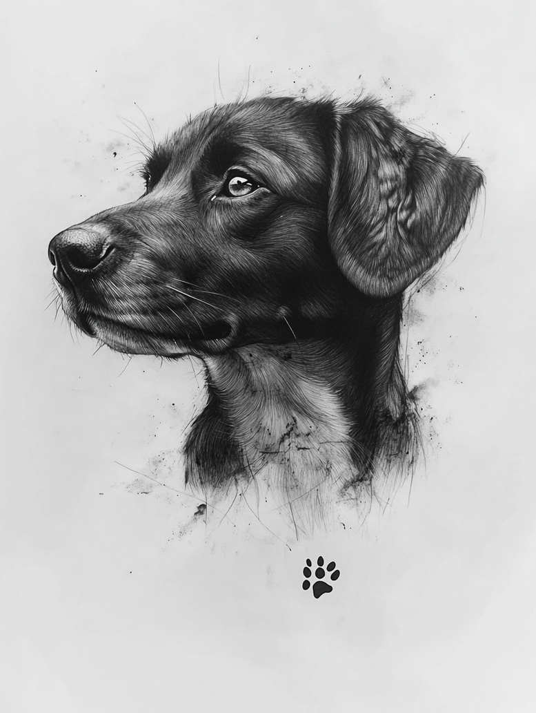 This piece presents a lifelike, black-and-grey dog head portrait rendered with graphite-inspired realism that would translate into a refined tattoo design. It relies on fine line strokes, subtle cross-hatching, and restrained splatter textures to convey the texture of short fur, the curve of the snout, and the glint in the eye. Visible elements include the dog’s head and neck in profile, with a small paw print stamp near the lower edge as a compact personal motif. The composition uses negative space and tonal gradients to create depth, a hallmark of black-and-grey tattoo illustration that preserves contrast on skin. Although created as a digital sketch, the crisp lines and shading read as a ready-to-ink concept, suitable for a custom tattoo design in a realistic or fine-line style. The paw print adds a meaningful touch—an intimate memorial or tribute—while remaining simple enough for a small-to-medium piece on the forearm, chest, or ankle. The artwork evokes loyalty and companionship, inviting interpretation by someone seeking a meaningful tattoo that couples a dog portrait with a quiet silhouette. This AI-generated tattoo project concept demonstrates how digital illustration can inform traditional ink, providing a reliable base for an artist to adapt to client anatomy and preferences, and to expand into a larger piece if desired. While the subject is a dog, the approach follows established tattoo conventions: realistic portraiture, controlled shading, and precise line work that holds up with age. In this sense, the design can serve as a flexible foundation for a custom tattoo design that grows with the wearer’s story.
