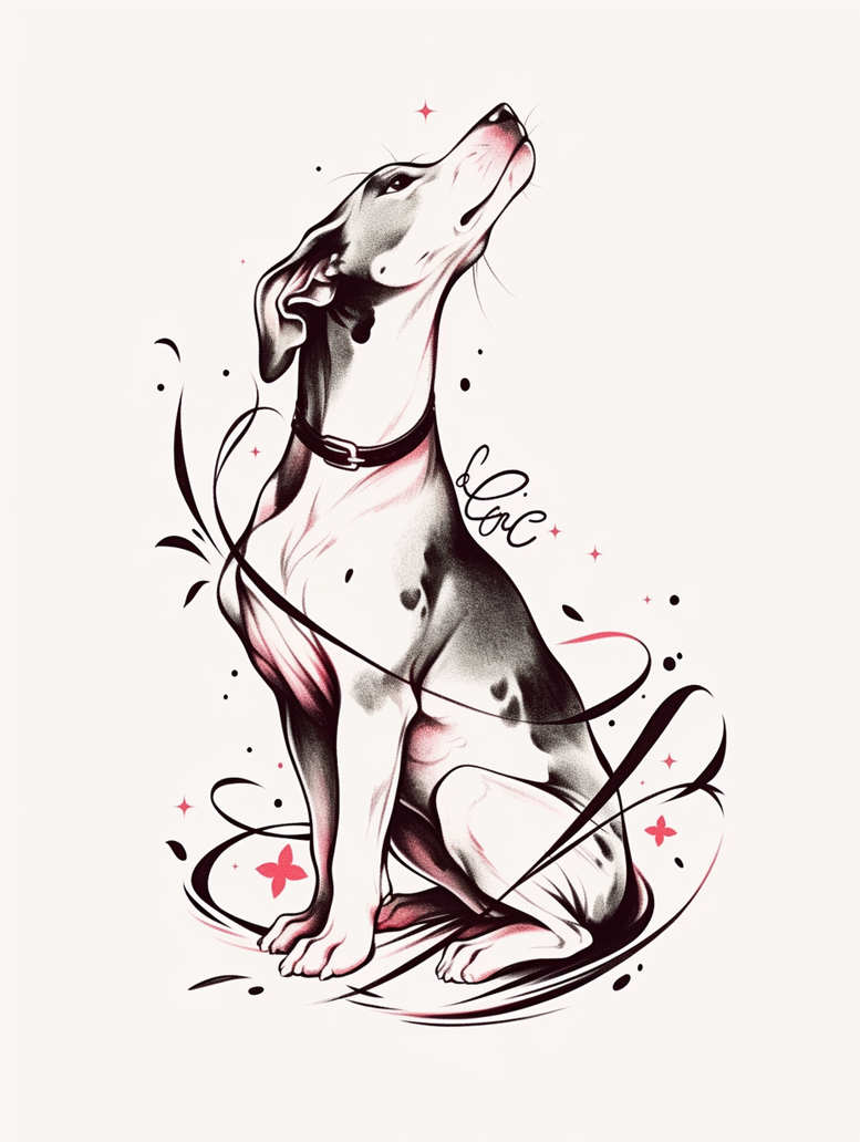 This tattoo design depicts a seated dog rendered in black and grey with subtle pink accents, framed by sweeping ornamental lines that flow around the form like inked vines. The portrait is executed in a refined fine line style, with delicate outlines and carefully graded shading that build volume without resorting to heavy blocks of ink. The dog’s awareness is captured in a lifted head and an attentive gaze, conveying loyalty, companionship, and quiet dignity—qualities that photographers and tattoo artists often seek to honor in animal portraits. Intertwined around the canine figure are flowing curves, spirals, and star-like flecks that create a dynamic sense of movement while preserving legibility on skin. The pink touches act as restrained highlights, drawing attention to key planes of the body, the curve of the neck, and the subtle contour of the chest, without overpowering the monochrome foundation. This balance between black ink, soft grey gradients, and selective color makes the design versatile for placement on the shoulder, rib, or calf and adaptable to sizes from small tattoos to larger, more expressive interpretations. The overall composition reads as a contemporary tattoo design that marries graphic elegance with lifelike form, making it suitable for meaningful tattoos or as a statement piece in a larger sleeve. The piece is an AI-generated tattoo project, offered as a creative starting point that a client can customize—refining line weights, adjusting the degree of pink accents, or converting the swirl motifs into a Japanese-inspired motif with restrained asymmetry. In technical terms, the line work emphasizes clean, crisp edges, with soft shading and subtle stippling to suggest depth, while the surrounding pattern elements provide cohesion and energy. This approach aligns with the broader trends in fine line and black and grey tattoos, and it invites discussion about symbolism—loyalty and protection embodied by the dog, celebration of companionship, and the elegance of minimalism in body art. For tag optimization, it supports keywords such as tattoo, tattoo design, meaningful tattoos, fine line tattoo, black and grey, animal portrait design, custom tattoo design, and small tattoos, as well as pattern-driven concepts that can be aligned with floral or geometric motifs in future iterations.