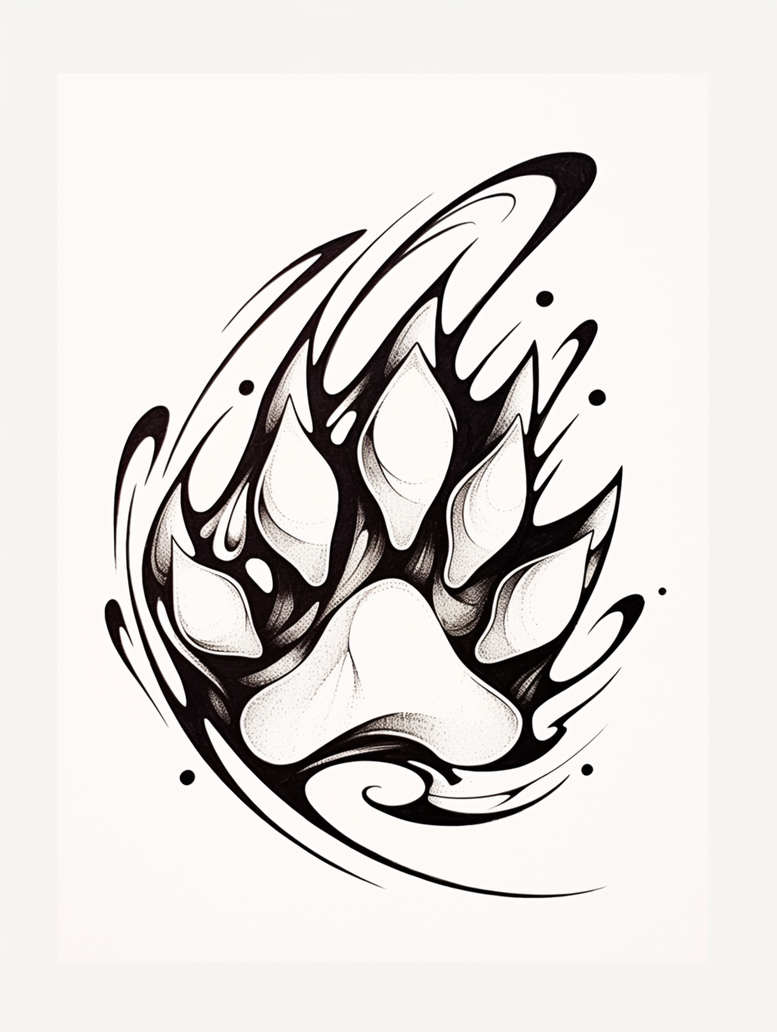 This AI-generated tattoo project concept presents a black and grey fine line design featuring a paw motif forged from flame-like teardrop shapes. The central paw pad anchors the composition, while sweeping curves form a halo of negative space that keeps the image legible at both small and large scales. Executed in solid black ink with subtle stippling and cross-hatching, the piece relies on crisp linework and careful shading to build depth without overpowering the negative space, a hallmark of the fine line tattoo approach. The pattern-like arrangement creates a rhythmic flow across the skin, making the design versatile for placements such as forearm, calf, shoulder blade, or as a component of a larger sleeve. Symbolically, the paw evokes loyalty, protection, and instinct, while the flame-inspired teardrop shapes hint at energy, transformation, and resilience; together they craft a meaningful tattoo concept that can be expanded with complementary motifs like leaves, lotus forms, or abstract tribal elements for a cohesive narrative. Although rooted in the black and grey palette, the piece remains adaptable to color if desired, and its strong silhouette ensures visibility over time on different skin tones. The design embraces the contemporary fine line tattoo aesthetic but also benefits from bold black regions to preserve legibility on aging skin, making it suitable as both a standalone statement and a foundational element for custom tattoo design within a Japanese or modern tribal-inspired context. In short, this is a versatile, AI-generated tattoo project that demonstrates how pattern-driven linework can translate into a durable tattoo design that resonates with fans of small tattoos, flower tattoos, and meaningful ink.