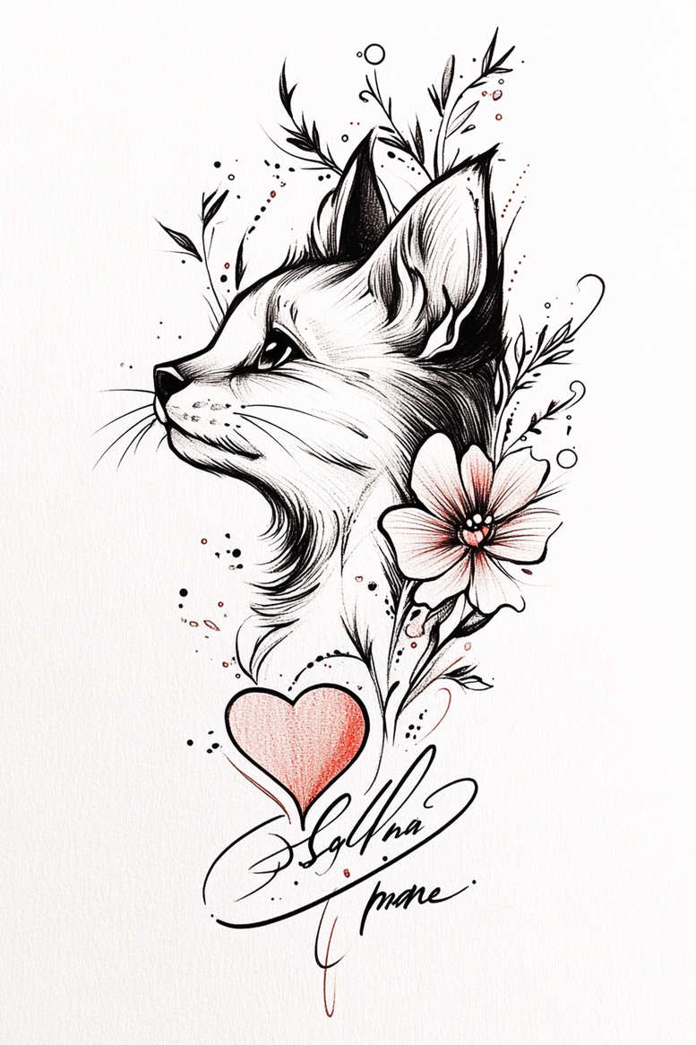 AI-generated tattoo project presents a refined cat head profile entwined with botanical motifs. The design places a poised feline gaze atop a delicately drawn flower and a curling heart, connected by flowing lines that mimic script. The linework is crisp and varied, employing fine-line technique to convey fur texture through subtle hatching and stippling, while shading builds depth without sacrificing a light, airy feel. The flower’s petals are softly shaded with touches of pink to accent focal points, and slender branches with tiny leaves orbit the main figure, creating movement and balance that read clearly on skin. The overall pattern reads as a cohesive decorative botanical portrait that can function as a standalone piece or be scaled for placement on the forearm, shoulder, or rib. The juxtaposition of animal portraiture and floral ornamentation nods to Japanese-inspired fine-line tattoos and modern flower tattoos, offering a versatile option for meaningful tattoos and flower tattoos. This tattoo design embodies personal symbolism: the cat’s serene profile evokes independence and curiosity; the heart motif suggests affection or loyalty; the floral elements symbolize growth and renewal. Executed in black and grey with strategic pink accents, the design remains legible over time, ensuring longevity even as a discreet piece. As an AI-generated design concept, it provides a contemporary starting point for a custom tattoo design, allowing a client to adapt scale, line weight, and color intensity while preserving the delicate, line-drawn aesthetic. Whether inked as a minimalist wrist piece or expanded into a larger body art composition, the balance of negative space, line economy, and decorative patterning makes this tattoo design attractive to those seeking flower tattoos or cat-inspired body art that reads as both elegant and meaningful.