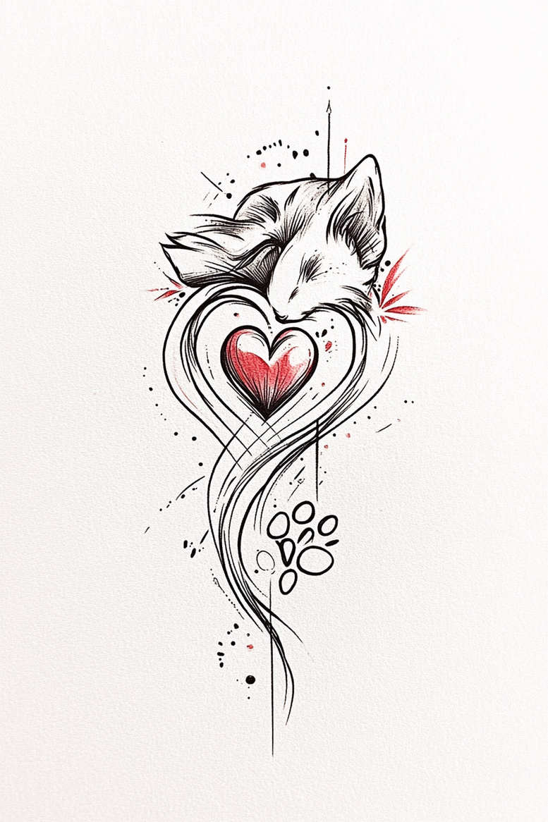 This is an AI-generated tattoo project concept featuring a cat head resting above a stylized heart, formed by sweeping flowing lines that curl into a ribbon-like motif. The composition reads as a delicate study in linework: the cat’s ears are alert, the muzzle hinted with fine hatch shading, and the heart is rendered with a bold red fill surrounded by an outer black contour that feels hand-drawn. The trailing lines cascade downward, creating movement, while small clusters of rounded shapes evoke paw prints. The overall effect is a harmonious balance between tenderness and energy, a motif suitable for meaningful tattoos and also playful symbolism. The color palette stays predominantly black ink with selective red accents, embracing a black and grey tattoo aesthetic while letting the red heart act as a focal point. Technique-wise, the piece leans into fine line tattoo aesthetics: precise tapering strokes, minimal shading, and deliberate negative space that preserves skin texture and ensures legibility as the tattoo ages. The pattern-like curls and dot tracery give the design a contemporary, graphic quality that translates well to smaller placements such as the inner forearm or behind the ear, yet retains enough structure to adapt to larger canvases. Being an AI-generated tattoo project, it demonstrates how modern algorithms can reinterpret timeless symbols—cat and heart—into fresh silhouettes that suit custom tattoo design, flower tattoos, or Japanese style tattoo lovers seeking a subtle ink. The concept nods to loyalty, protection, and love—the cat as guardian, the heart anchoring emotion, and the flowing lines representing life’s thread. In essence, this design offers a refined blend of line precision and expressive ink that appeals to both traditionalists and fans of modern, abstract body art. The result is a versatile tattoo design that remains legible across sizes, adaptable to different areas, and capable of aging gracefully while serving as a lasting symbol.