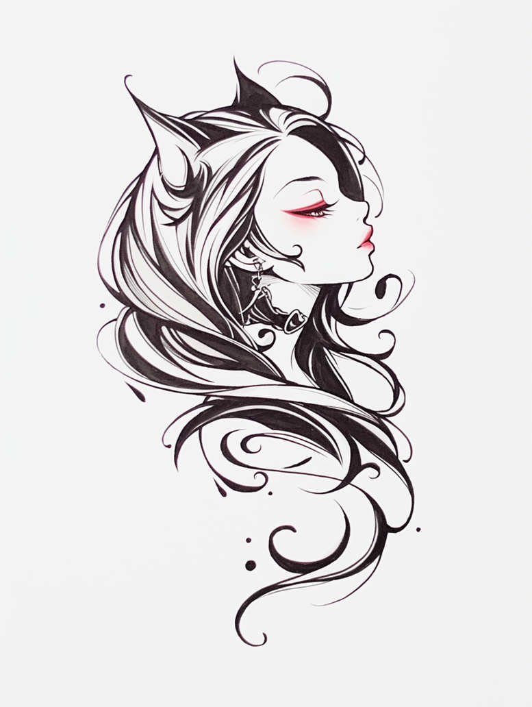 This is an AI-generated tattoo project featuring a demoness in profile, rendered in crisp black-and-grey ink with flowing hair and horn-like accents. The design relies on bold line work and restrained shading to create depth without solid fills, enabling easy adaptation to various placements. The subject’s serene facial expression is offset by the graphic curls of hair that sweep downward, while small decorative elements such as an earring and a neck choker provide focal points. Negative space is used intentionally to enhance legibility and longevity on the skin, making it a strong choice for small to medium-sized tattoos or as a cover-up over existing darker ink. Visible elements include the profile silhouette, horns, hair, earring, and necklace, all integrated through a cohesive, flowing composition. The black-and-grey palette offers timeless appeal and compatibility with most skin tones, while the fine-line technique delivers precision and subtle detail that appeal to fans of modern tattoo design. Although AI contributes to the concept, the final tattoo should be refined by an experienced artist to ensure clean lines and lasting longevity. This piece aligns with contemporary tattoo trends such as minimalism, Gothic-inspired portrait motifs, and Japanese-style linework in its emphasis on clean, dynamic contours. It embodies meaningful body art and ink-ready potential, and its bold swirls and horned silhouette make it particularly suitable as a cover-up option on darker skin or over old tattoos, underscoring its role as a premium black-and-grey tattoo design.