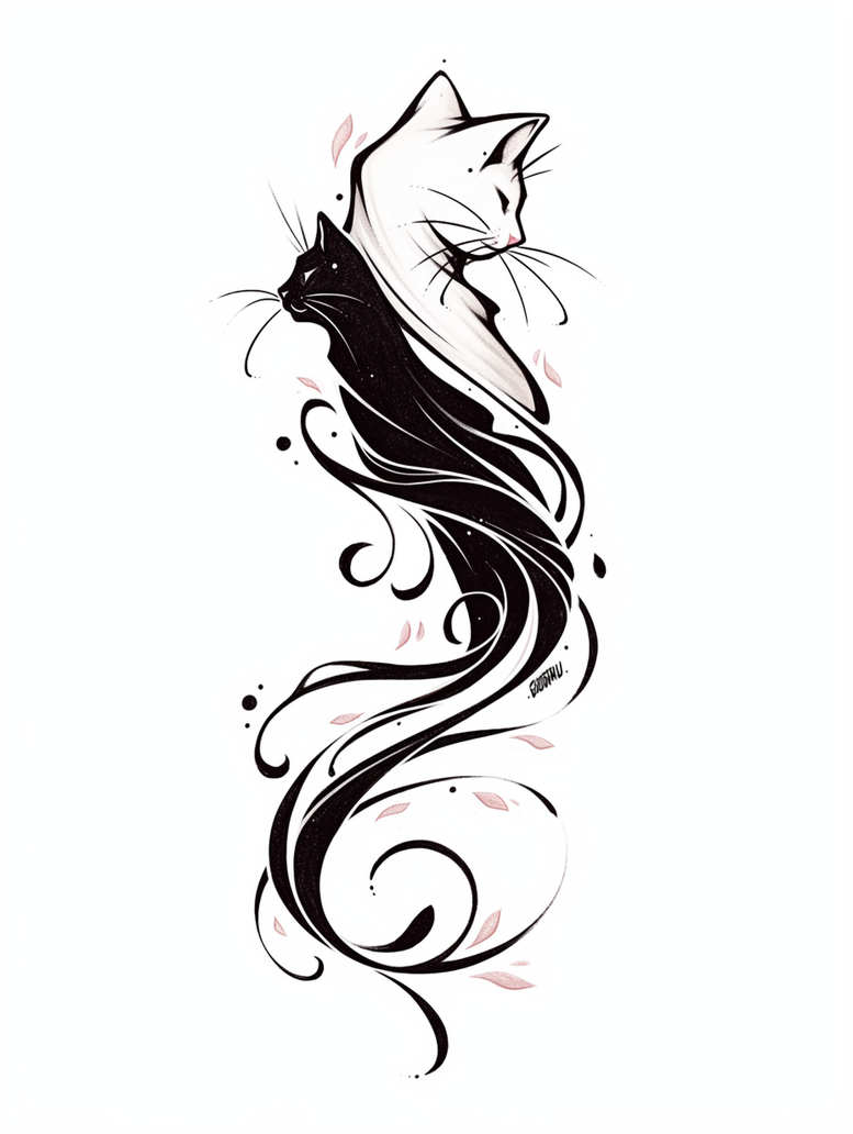 This AI-generated tattoo project presents a refined duet of cats formed from flowing black lines and negative space, arranged in a vertical composition that emphasizes elegance, motion, and balance. The two feline figures, one rendered as a bold black silhouette and the other as a lighter contour, intertwine with sweeping swirls that rise along the spine or arm as a continuous ribbon of ink. The design employs a mix of solid fills and intricate line work to create depth, while slender branches and petal-like accents provide contrast against the monochrome base, with delicate pink hints that read as subtle blossoms. The overall effect is a sophisticated study in black and grey, suitable for clients seeking a meaningful tattoo that blends animal symbolism with ornamental pattern. Symbolically, cats often represent independence, curiosity, and resilience, making this piece an ideal canvas for personal narratives about duality, companionship, or growth. The swirling motifs evoke movement and evolution, echoing vines or waves, and the use of negative space ensures the composition breathes, preventing the ink from feeling overcrowded. As a tattoo design, its strong focal lines and fine-line accents support both large-scale placements and smaller, discreet panels, while its dark components offer a robust option for cover-up of faded marks. The piece embraces a graphic aesthetic with versatile line weights that translate well into long-lasting, crisp line work. Because this is an AI-generated tattoo project, it offers a contemporary starting point for collaboration between artist and client, allowing adaptation in scale, shading, and style. It can be tweaked toward Japanese-inspired silhouettes, tribal weaving, or pure black-ink statements, depending on the wearer’s preference and body canvas. In sum, the two-cat motif with swirling stems and petal accents embodies a timeless exploration of companionship and instinct, while delivering a striking, highly adaptable tattoo design for black and grey ink, realistic body art, and small to large formats, and it clearly positions itself as a versatile option within modern ink aesthetics, including patterns and line-driven aesthetics.