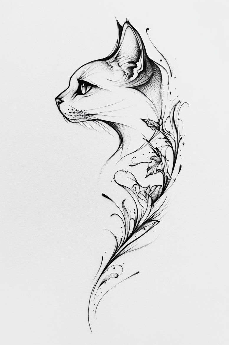 This tattoo concept presents a refined cat profile drawn in black fine-line ink, accompanied by an ornamental botanical vine that climbs along the neck. The artist uses slender lines, gentle stippling, and subtle shading to convey fur texture and depth while preserving an airy, embroidery-like quality. The cat’s profile is calm, with a focused gaze that grounds the composition. The vine sprouts leaves and curling tendrils that weave around the neck, creating negative space and a natural rhythm that guides the eye from the jawline to the shoulder. The overall piece reads as a delicate pattern rather than a solid block of ink, making it suitable for smaller canvases or as an elegant accent in a larger sleeve. The design embraces both classic and contemporary motifs—fine-line tattoo, black-and-grey ink, and botanical ornament—while remaining adaptable as a custom tattoo design across styles. The botanical elements symbolize growth and resilience, while the cat evokes curiosity and independence, giving the piece layered meaning for meaningful tattoos. While this concept is presented as a digital sketch, it reflects practical tattooing considerations: clean line work, balanced spacing, and scalable composition that can be adjusted for forearm, collarbone, or rib-area placements. As an AI-generated tattoo project, it demonstrates how digital tools can inspire real-world ink. This tattoo design stands out for its elegance, legibility, and potential for personalization with subtle shading or color accents; it’s ideal for small tattoos or as the centerpiece of a larger botanical sleeve. Keywords to consider include tattoo, tattoo design, meaningful tattoos, fine line tattoo, lotus flower tattoo, infinity tattoo, tribal tattoo, rose tattoo design, small tattoos, flower tattoos, custom tattoo design, Japanese style tattoo, black and grey, realistic tattoo, body art, ink.