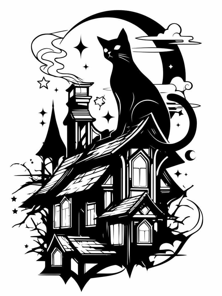Designed as an AI-generated tattoo project, this nocturnal composition partners a sleek cat with a Gothic house beneath a bright crescent moon, all rendered in stark black and grey. The cat sits poised on the roof ridge, its tail curling around the gables while smoke drifts from the chimney and the sky is dotted with clouds and stars. The high-contrast silhouette approach ensures the image reads clearly on skin, with solid blacks defined against negative space and crisp line work that holds over time. The house’s steep roofs, pointed arches, and mullioned windows contribute a feel of classic drama, while the simplified shapes lend a modern graphic quality that translates well into ink. In terms of technique, the design relies on bold outlines, dense fills, and selective detailing to maximize legibility on a variety of body parts; the moon’s circular form acts as a focal point that balances the architecture and the feline figure. This tattoo design is especially suitable as a cover-up thanks to its heavy black blocks that can mask older tattoos beneath it, and its interlocking shapes provide a strong, unified composition even when scaled down. Symbolically, the cat evokes guardianship, independence, and mystery, while the haunted house hints at memory, hidden stories, and night-time transformation; themes often embraced by meaningful tattoos and personal symbolism. For wearers exploring small to large formats, this design adapts well to forearms, calves, or shoulders, and can be tuned to suit Japanese-inspired, black-and-grey realism, or bold tribal-influenced interpretations within the wider custom tattoo design landscape. In the broader tattoo world, it embodies the enduring appeal of ink that is both striking at first glance and rich with interpretive depth, a compelling example of modern body art that blends architecture, fauna, and nocturnal atmosphere into a single, memorable tattoo concept.