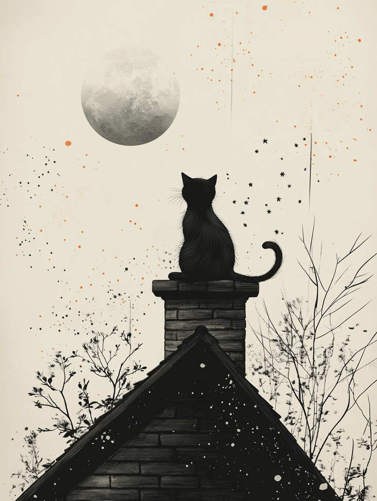 AI-generated tattoo project concept presenting a nocturnal cat silhouette perched on a chimney atop a steep roof, set beneath a luminous moon. The composition uses stark black ink and negative space, with fine line detailing in the cat’s fur and the surrounding leafless branches that frame the rooftop. Orange and charcoal splatters scatter across the sky, adding a sense of motion and an abstract pattern that contrasts with the architectural precision of the rooftop. The mood is quiet yet enigmatic, a study in night-time symbolism where independence, mystery, and solitude meet urban geometry. The cat’s posture—still, aware, observant—evokes a subtle narrative about boundaries and watchfulness. The moon provides a celestial counterpoint, balancing the solid, grounded roof with a luminous orb. Techniques emphasize silhouette work with crisp linework and restrained shading, leaning into a black and grey palette while allowing the orange accents to spark visual interest without overpowering the composition. This concept can serve as a refined tattoo design for a small, meaningful piece or as a larger, cover-up-friendly project where dense black areas can conceal underlying ink. The presence of light splatters and star-like specks introduces a pattern-like texture that aligns with modern tattoo design, bridging elements of graphic art with traditional body art. As an AI-generated tattoo project, it demonstrates how algorithmic ideation can yield cohesive motifs suitable for a variety of skin tones and placements. Whether framed as a Japanese-style influence through minimalism or interpreted as a contemporary black and grey scene, the design remains versatile for both detailed linework and solid-black fills. Its symbolism—night, moon, and a solitary observer—offers meaningful tattoos for clients drawn to themes of resilience, mystery, and personal boundary-setting, while comfortably aligning with keywords such as tattoo, tattoo design, meaningful tattoos, fine line tattoo, lotus flower tattoo, infinity tattoo, tribal tattoo, rose tattoo design, small tattoos, flower tattoos, custom tattoo design, Japanese style tattoo, black and grey, realistic tattoo, body art, ink. If used as a cover-up, the density of black ink and the layered composition make it particularly effective in concealing previous work while preserving a striking silhouette.