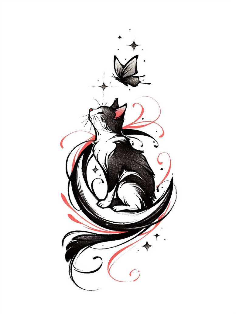 This piece presents a clean, high-contrast composition centered on a cat and a butterfly, produced as an AI-generated tattoo project. The design places a black-and-white cat in a seated, upright pose, its fur rendered with bold black fills and delicate linework to define features and musculature. A crescent-like tail sweeps beneath the cat, forming a sweeping cradle that anchors the composition. Red swirls weave around the animal, tracing the silhouette with lively energy and guiding the eye toward the butterfly hovering above. The butterfly is rendered with soft gradient shading on the wings, creating a sense of lightness that contrasts with the solid block of the cat’s body. Small star shapes punctuate the spaces, acting as celestial accents and giving the overall layout a feeling of motion and whimsy. The artwork embraces a graphic, fine line approach, where the strokes are precise, spacing is intentional, and the contrast between black ink and crimson accents ensures visibility on skin. The red elements act as focal points, suggesting vitality and transformation, while the cat embodies independence and curiosity. The crescent tail acts as a natural baseline, grounding the piece and providing a subtle nod to lunar symbolism. Though primarily composed of black ink, the selective red highlights keep the tattoo design vibrant and modern, suitable for a range of placements from forearm to thigh, and adaptable to both large-scale and smaller intimate commissions. As a contemporary tattoo concept, the piece demonstrates how AI-generated tattoo projects can translate into bold, wearable body art; the pattern-rich swirls and star motifs contribute to a cohesive aesthetic that nods to traditional motifs while staying fresh and relevant in a black-and-red color palette, reinforcing the long-standing appeal of fine line and graphic tattoo design across graphics, ink, and body art contexts.