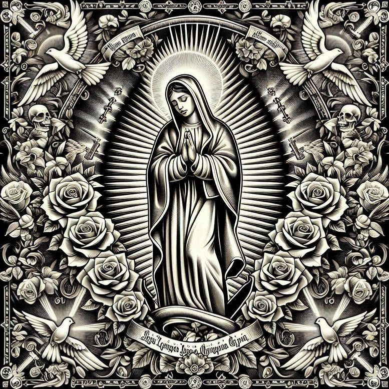 This AI-generated tattoo project features a central Virgin Mary in prayer, anchoring a dense, ornamental frame that pairs religious symbolism with floral life. Rendered in black and grey, the piece uses crisp line work and smooth gradient shading to achieve a realistic tattoo aesthetic while maintaining bold readability at typical sizes. The Mary figure stands with hands clasped, robes folded in soft three-dimensional folds that catch light and create depth, set against a radiant halo of radiating lines that push the viewer’s gaze toward a solemn expression. Surrounding the sacred figure are rose clusters, their layered petals crafted with careful stippling and shading to convey texture and depth, and doves in mid-flight that symbolize peace and spiritual ascent. Skulls appear near the edges as a quiet reminder of mortality, balanced by a curling banner bearing script at the lower register. The composition’s symmetry and dense ornamentation echo traditional religious iconography while accommodating contemporary tattoo design principles, making it a versatile choice for those seeking a powerful, story-driven body art piece. The design leans toward a fine line and realistic tattoo sensibility, with meticulous attention to negative space, contrast, and edge definition so the artwork remains legible on the forearm, upper arm, back, or chest. For collectors and seekers of meaningful tattoos, this piece weaves faith, memory, and beauty into a single, cohesive narrative that can be tailored to cover-up previous work without sacrificing the subject’s iconic identity. Its dark, high-contrast execution provides strong coverage and can be tuned to obscure underlying lines while preserving the central Mary motif, which makes it particularly well-suited as a cover-up tattoo design. Given its roots in black and grey tonalism and its decorative floral mechanics, the tattoo embraces both flower tattoos and religious iconography in a way that resonates with fans of Japanese style tattoo elements and Western sacred art alike. On the technical side, the project demonstrates how AI-generated tattoo concepts can translate into practical, tattoo-ready designs that honor tradition while offering modern flexibility, enabling tattoo studios to present a custom tattoo design that remains meaningful over time. Keywords accompanying this piece include tattoo, tattoo design, meaningful tattoos, fine line tattoo, lotus flower tattoo, infinity tattoo, tribal tattoo, rose tattoo design, small tattoos, flower tattoos, custom tattoo design, Japanese style tattoo, black and grey, realistic tattoo, body art, ink.