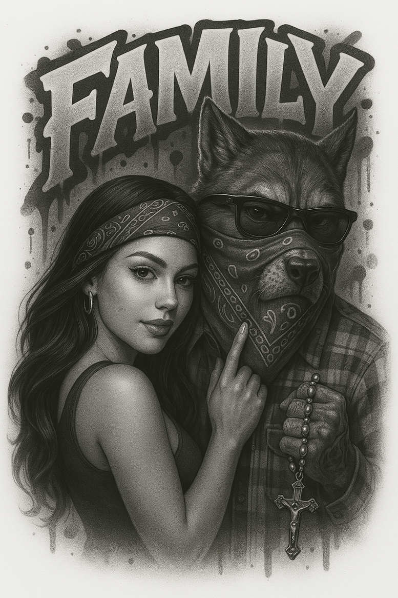 AI-generated tattoo project concept rendered in black and grey realism, this design centers on a close portrait of a woman and a dog, united by a shared sensibility and a bandana motif. The composition balances soft shading with crisp detailing to render hair, fur, fabric textures, and the beads of a rosary; the woman’s features are refined and her expression calm, while the dog wears sunglasses and a bandana, anchored by the cross pendant along a beaded rosary. Above them looms bold graffiti-style lettering reading FAMILY, providing a stark backdrop that frames the duo and reinforces the theme of kinship. The bandana patterns and the plaid texture of the dog’s shirt introduce graphic rhythm across the piece, enhancing composition and readability. The narrative centers on family as a protective circle, where loyalty and love are inked in timeless black and grey. The realistic technique relies on layered shading, controlled contrast, and subtle highlight work to create lifelike textures—skin, hair, fur, and fabric—while preserving clarity when scaled to small sizes or adapted for sleeve or chest placements. Although AI-generated, the concept adheres to traditional tattoo design principles: balance, legibility, and the capacity to tell a personal story through body art. Keywords such as tattoo, tattoo design, meaningful tattoos, fine line tattoo, lotus flower tattoo, infinity tattoo, tribal tattoo, rose tattoo design, small tattoos, flower tattoos, custom tattoo design, Japanese style tattoo, black and grey, realistic tattoo, body art, ink are woven throughout to support searchability and inspiration for clients exploring custom tattoo design opportunities.