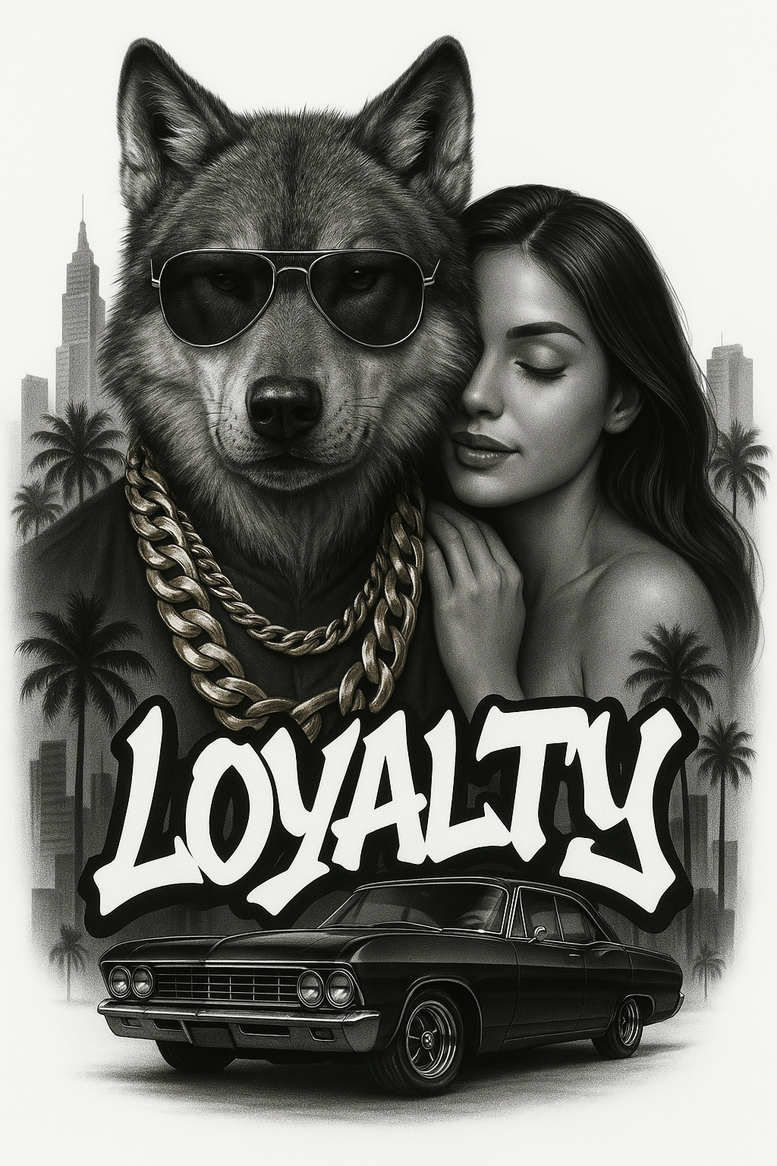 An AI-generated tattoo project presented as a bold, graffiti-inspired composition built around the loyalty motif. The focal point is a wolf head wearing sunglasses, rendered with meticulous black-and-grey shading, anchored by a chunky gold chain and accompanied by a poised woman. A vintage car sits beneath them, while stylized palm trees and a distant skyline provide a street-art backdrop that reframes traditional animal-and-portrait tattoos into a contemporary hybrid. The design orchestrates several focal elements into a cohesive whole: the wolf’s calm, protective gaze conveys loyalty and guardianship; the woman’s intimate gesture hints at companionship; and the oversized LOYALTY lettering ties the scene together with a graphic, graffiti-tinged energy. Textures are carefully modeled—the gloss of the chain, the satin sheen of the woman’s hair, the chrome of the car—while deliberate negative space around the typography ensures readability on skin. Though rooted in black-and-grey realism, the piece borrows bold, high-contrast silhouettes common in street art, making it suitable for a large sleeve, back, or chest piece. For a client seeking a dramatic narrative in a single study, this tattoo design balances meaning with style, presenting a meaningful tattoo that can be scaled and adapted across sizes. The project embraces a darker palette, reinforcing its potential as a cover-up: the dense blacks can obscure older work while preserving a striking, contemporary silhouette. These are AI-generated tattoo projects, crafted to explore new frontiers in tattoo design and body art, and to inspire custom tattoo design in black and grey.