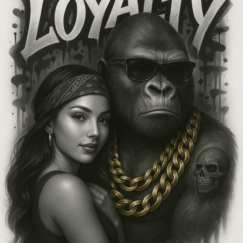 AI-generated tattoo project concept presented as a high-contrast grayscale composition featuring a gorilla and a poised woman, united by an iconic gold chain. The gorilla wears dark sunglasses, his expression stoic, while the woman leans close, bandana tying her hair back. A skull tattoo rides on the gorilla’s arm, adding a macabre accent that complements the urban graffiti backdrop where the letters LOYALTY loom behind them. The piece is rendered in black and grey with selective metallic gold highlights on the chain, creating a striking focal point that reads as both luxury and danger. The technique emphasizes smooth tonal transitions, subtle cross-hatching, and meticulous texture work on fur, skin, jewelry, and the skull motif to achieve a near-photographic realism while preserving a bold graphic quality suitable for a large-scale tattoo. From a design perspective, the juxtaposition of animal strength and human companionship suggests loyalty forged through shared experiences, while the graffiti setting anchors the concept in street-art culture and urban symbolism. The composition employs a restrained palette to maximize contrast; the dark shading provides depth, while the gold chain adds a luminous counterpoint that catches light as a central design element. As a tattoo design concept, this AI-generated project demonstrates how strong silhouettes, reputable subject matter, and meaningful tattoos can translate into a cover-up-ready solution for older ink or dense dark work, without sacrificing narrative clarity. The narrative arcs through power, protection, and partnership, inviting a commission-ready discussion of size, placement, and line quality for a refined, realistic tattoo that remains versatile for sleeves, chests, or back pieces. Keywords to guide search and tagging include tattoo, tattoo design, meaningful tattoos, fine line tattoo, lotus flower tattoo, infinity tattoo, tribal tattoo, rose tattoo design, small tattoos, flower tattoos, custom tattoo design, Japanese style tattoo, black and grey, realistic tattoo, body art, ink.