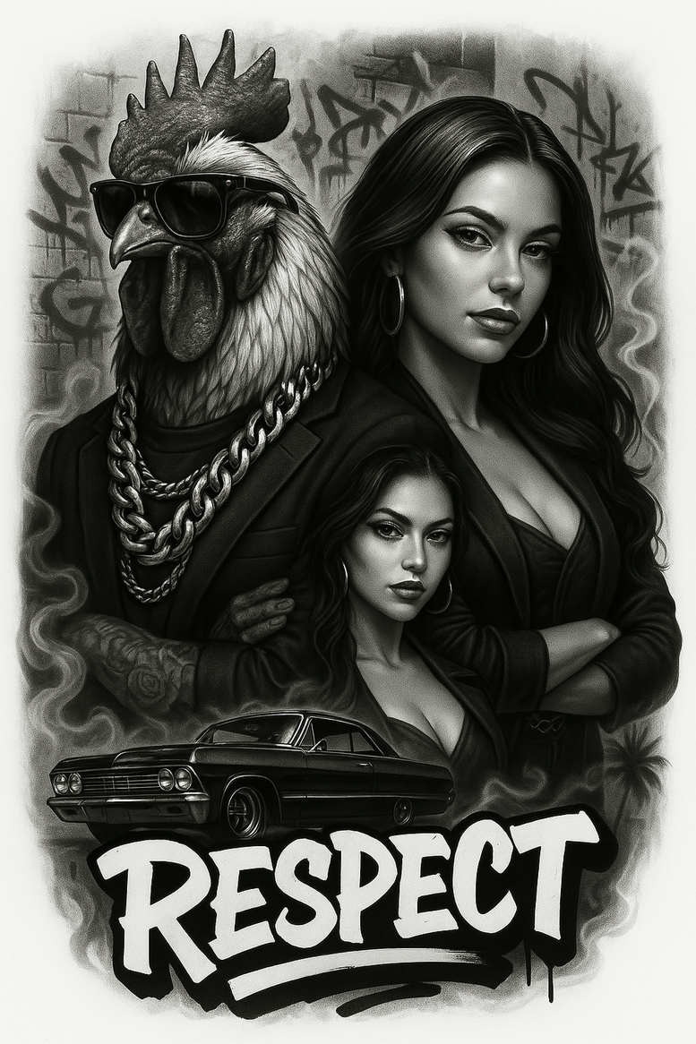 AI-generated tattoo project concept in black and grey realism, this piece melds street portraiture with classic Americana. The composition centers on a chicken head wearing dark sunglasses, rendered with dense feather shading and highlight work that creates a lifelike yet sculptural silhouette. A chunky chain and a tailored jacket wrap around the neck and shoulders, giving the bird a streetwise apparel sensibility. To the right and lower, two women are depicted with precise linework and soft shading, their faces conveying confidence and attitude while wearing hoop earrings that catch the light. A vintage car anchors the lower edge of the scene, its chrome rims and glossy surface achieved through careful gradient transitions. Behind and around the figures, graffiti textures fill the backdrop, providing graphic patterns that add depth and urban energy. Across the foreground, the word RESPECT is lettered in a bold, stylized script that interacts with the car and the smoke-like shading, creating a dynamic typographic focal point. The entire scene is executed in black and grey, with high-contrast shadows and smooth midtone transitions that translate well to large-scale work on the body. This tattoo design is a versatile concept for a meaningful tattoo or tribute piece, capable of adaptation to different placements and sizes, from forearms to full-back panels, while preserving clarity of the characters and the lettering. The symbolism blends resilience, loyalty, and street-craft ethos—an homage to urban culture and to the idea of respect as a core value. For clients seeking a custom tattoo design, the composition offers opportunities to adjust line weight, add negative space, or reframe elements for a more graphic or more photorealistic result. As an AI-generated tattoo project concept, it demonstrates how digital artistry can translate into clinic-ready ink, especially when the goal is a powerful cover-up with dense dark shading that still reads clearly at a distance. Keywords integrated here include tattoo, tattoo design, meaningful tattoos, fine line tattoo, lotus flower tattoo, infinity tattoo, tribal tattoo, rose tattoo design, small tattoos, flower tattoos, custom tattoo design, Japanese style tattoo, black and grey, realistic tattoo, body art, ink, and urban symbolism.